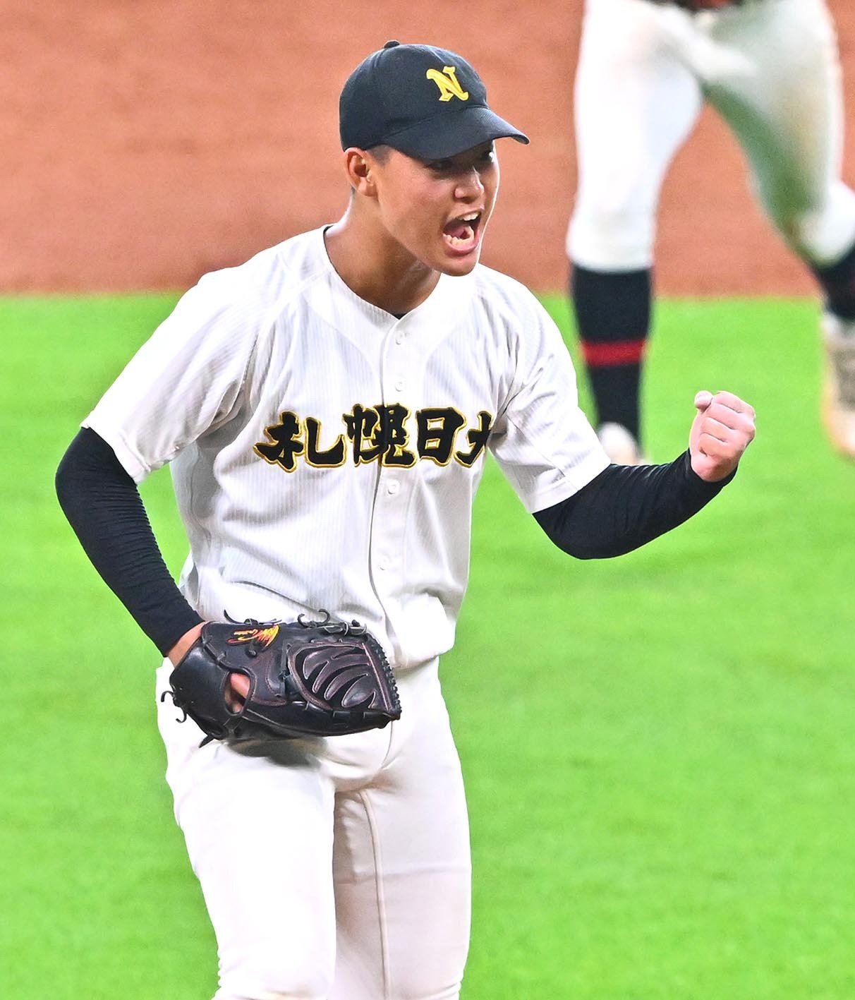 九回2死、立命館慶祥の浅見を二ゴロに打ち取ってガッツポーズを見せる札幌日大高の小熊