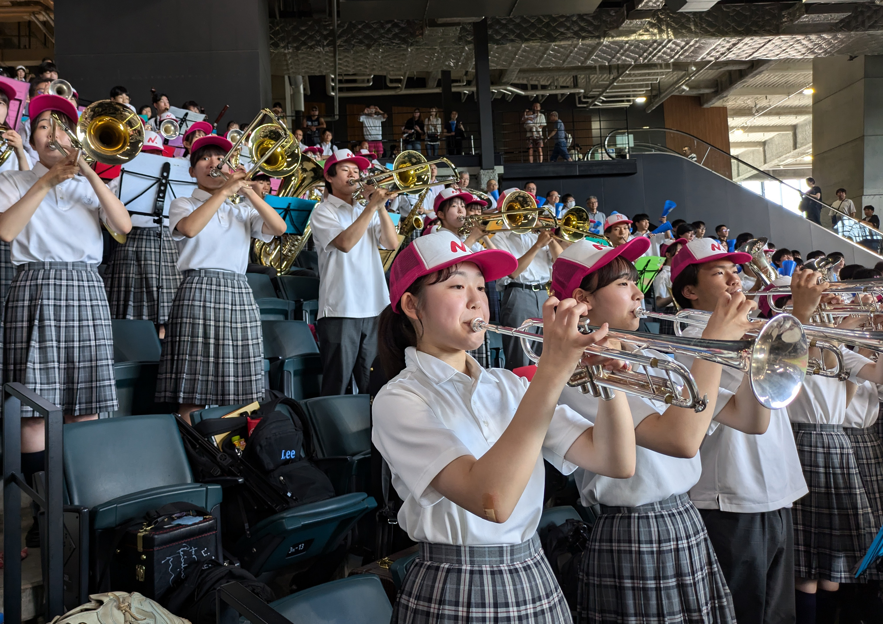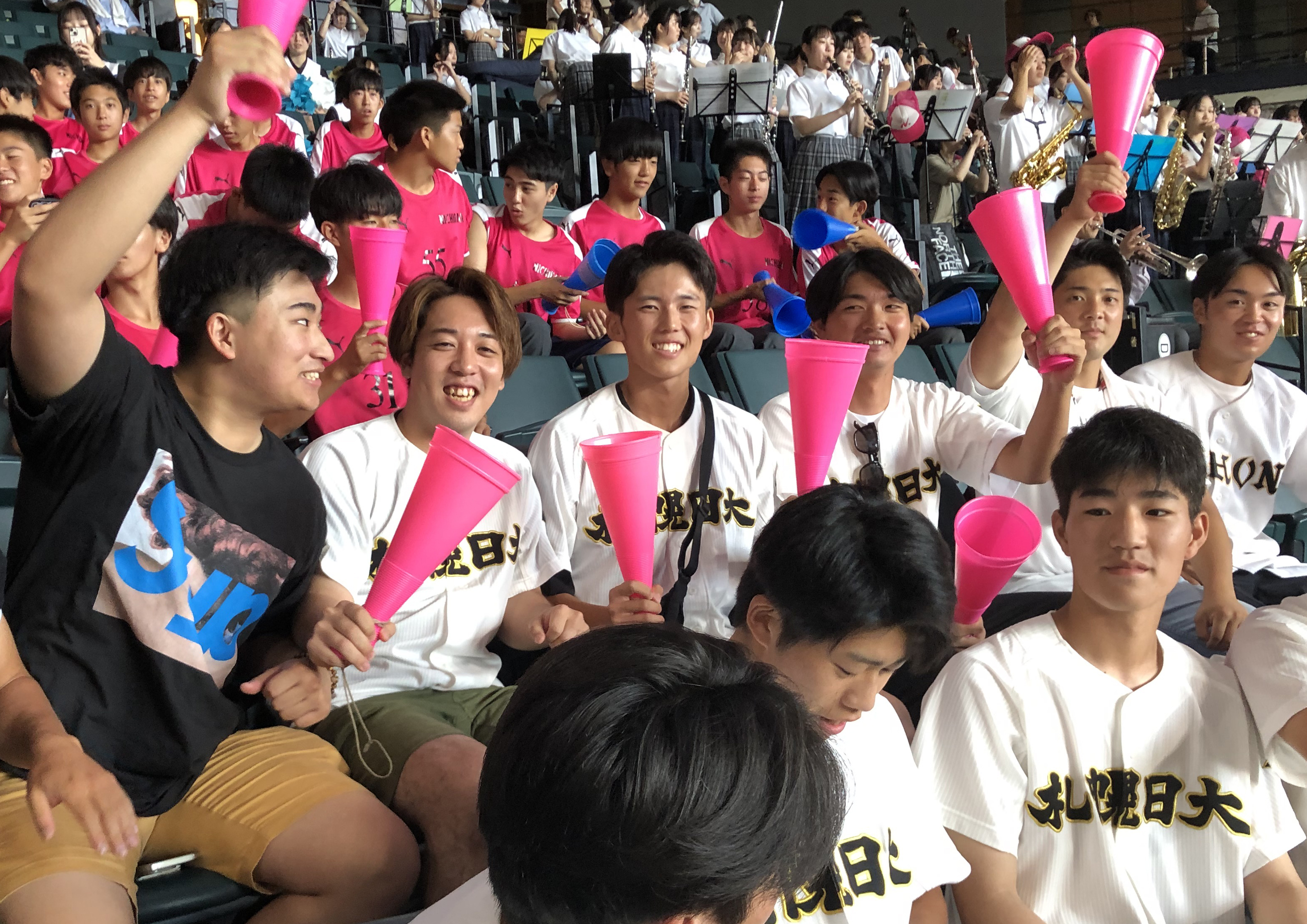 大応援団をけん引したのが札幌支部代表決定戦から5試合連続で駆けつけた90人の吹奏楽部だ。OBの山本真幸さん作曲のオリジナルチャンステーマ「Nichidai Pride(日大プライド)」「ブレイクスルー」を含む6曲を披露。久野穂南部長(3年)は「本当に勝ってほしい。とにかく選手にエールを送れれば」と、一糸乱れぬ大音量の演奏で選手たちを後押しした。