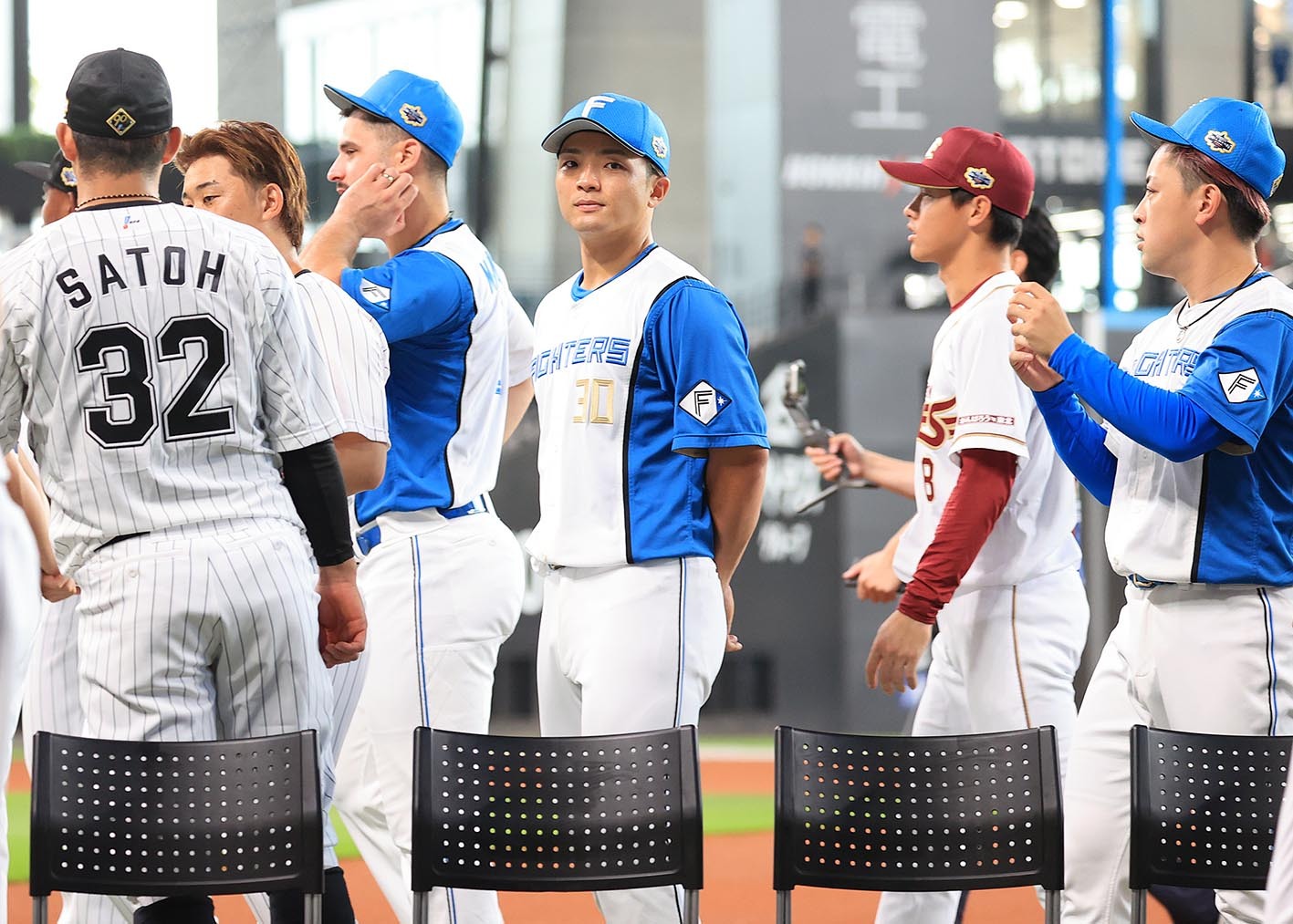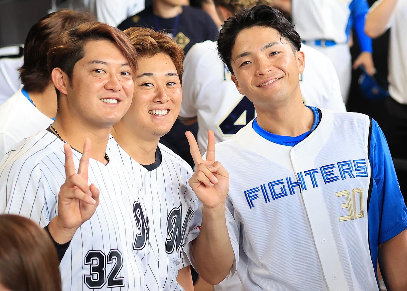 記念撮影のためグラウンドへ。ベンチ内で道スポカメラマンを発見すると、そばにいたロッテの佐藤&鈴木とパシャリ。ナイスショットです。