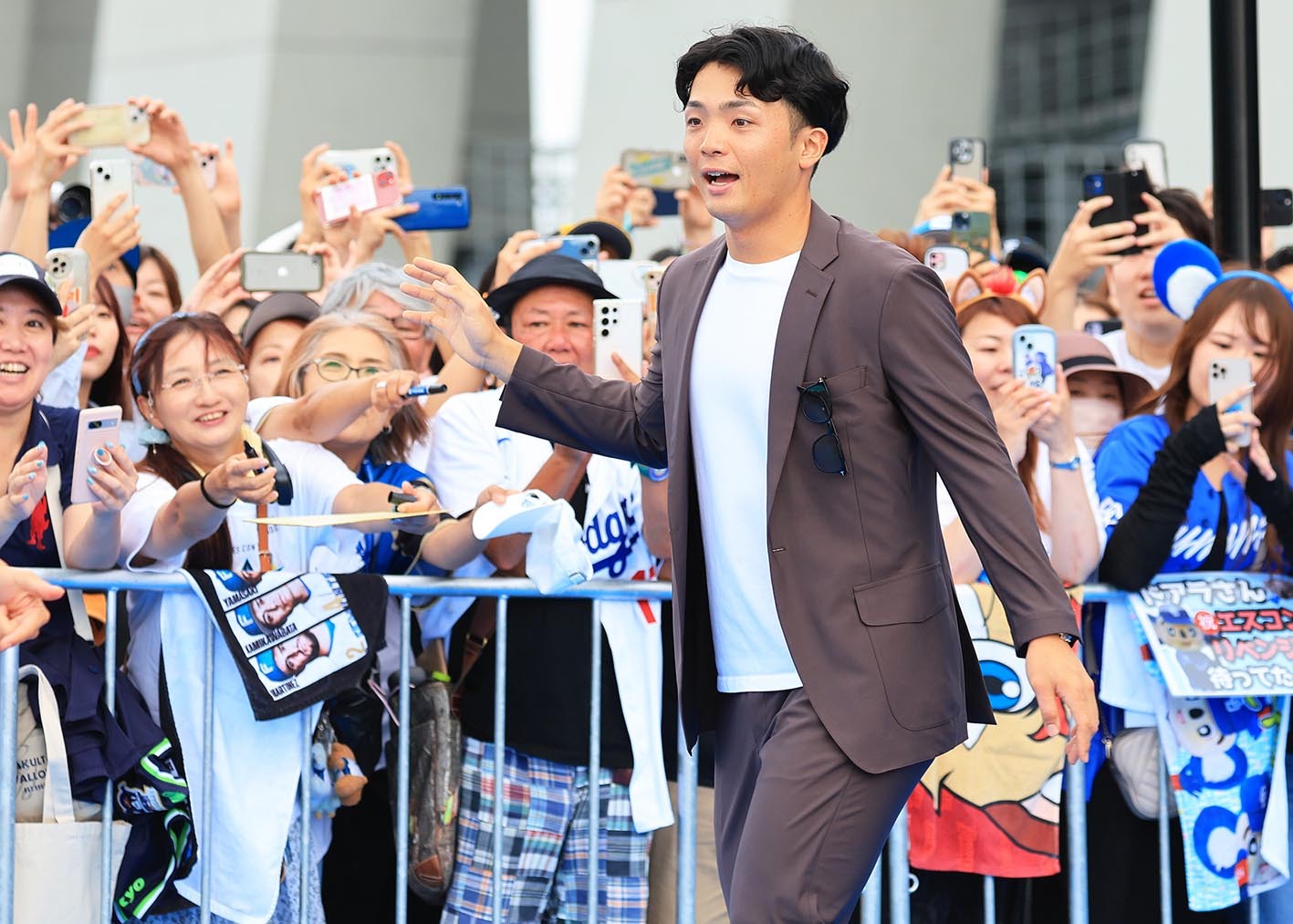 ファイターズ勢がブルーカーペットショーに1番手で登場。両手ピースを額に当てる〝ゆあビーム〟のポーズを決めた。郡司はブラウン系のセットアップに白シャツを合わせた爽やかなファッションで現れ、笑顔でファンに対応した。