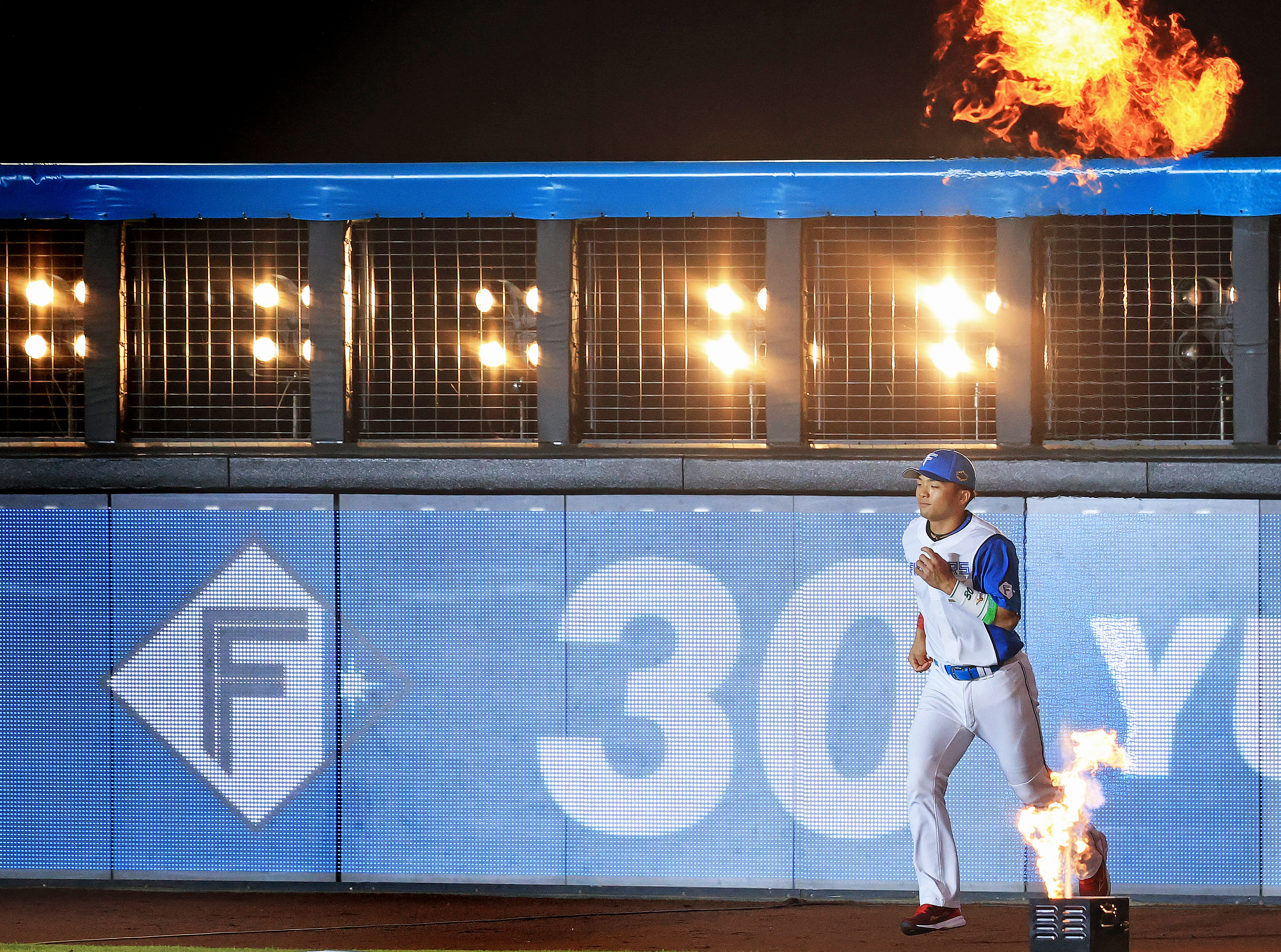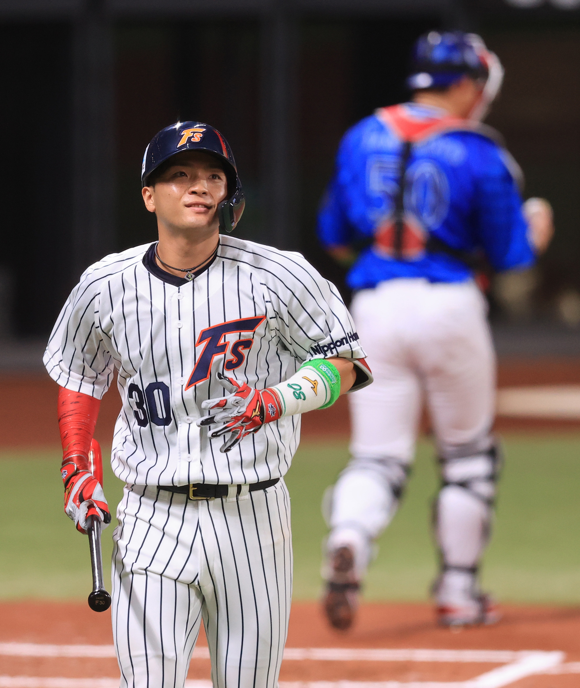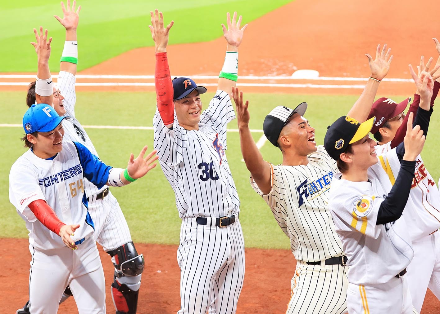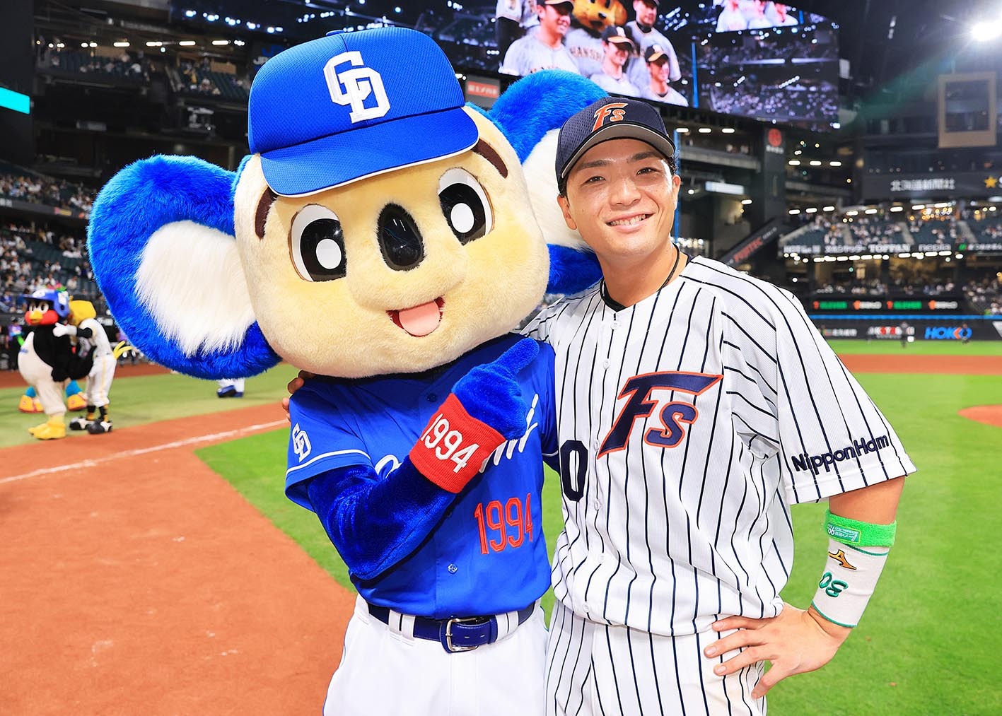 新庄監督の発案でファイターズ勢は歴代ユニホームを着用。郡司は北海道移転前の縦縞ユニホームに袖を通した。