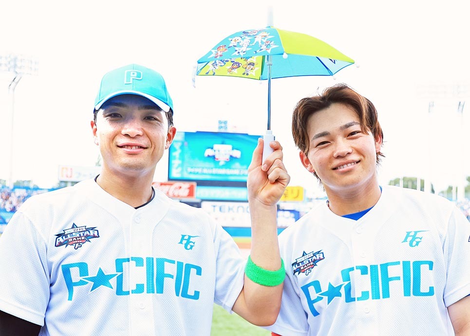 神宮球場といえば傘ということで、オールスター公式グッズで田宮(右)と相合い傘の郡司