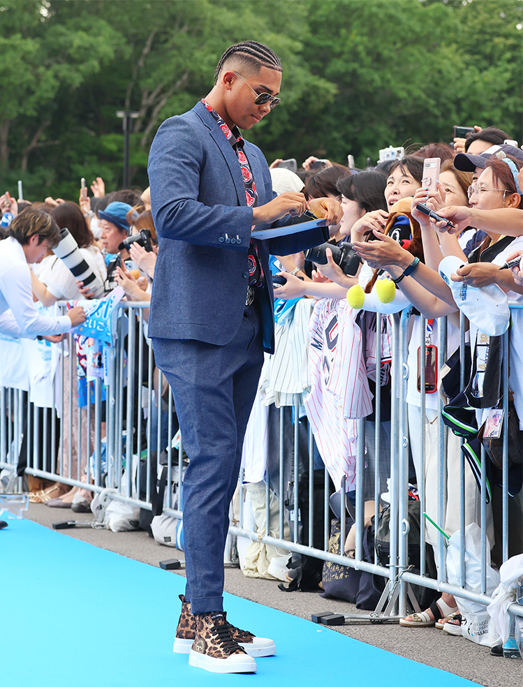 初出場した球宴のブルーカーペットショーでは、スーツに派手な柄のシャツを合わせ、サングラスを着けて登場。髪はカットと編み上げで4時間ほどかけた「コーンロウ」。ナイジェリア人の父を持つ水谷にとって、アフリカが発祥とされるコーンロウは何度も取り入れているなじみのヘアスタイルだ。