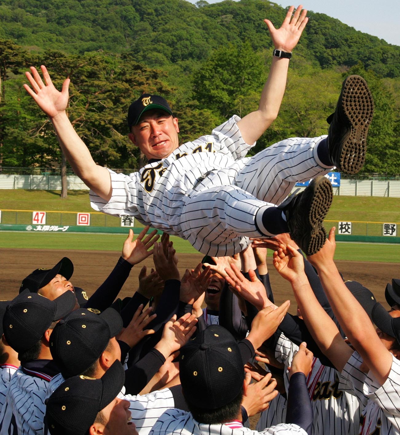 2008年春の全道大会で優勝し、選手たちから胴上げされる大脇前監督