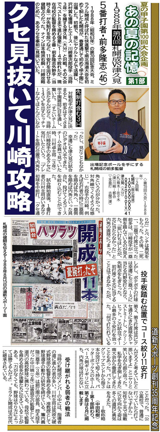 第5回は1988年の南北海道大会で「ミラクル開成」と呼ばれる快進撃で初優勝し、第70回記念大会に出場した札幌開成の熱戦を振り返った企画「あの夏の記憶」。初戦の2回戦で、後にヤクルト入りした大物エースを擁する津久見(大分)と対戦し、3安打と活躍した理由を、当時母校の監督を務めていた前多隆志さんが明かした。