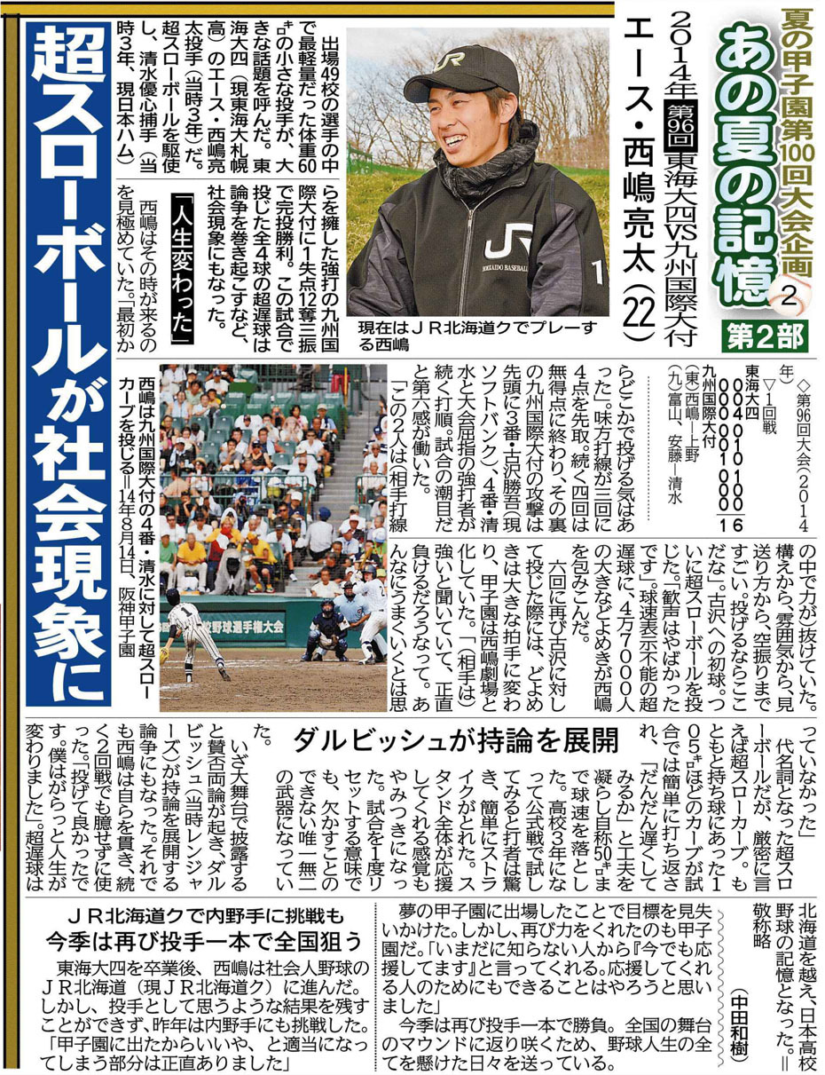 第6回は2014年第96回大会に出場し、球速表示不能の超スローボールを投じて注目を集めた東海大四(現・東海大札幌高)の西嶋亮太さんを紹介した「あの夏の記憶」。1回戦の相手は、現在北海道日本ハムファイターズの清水優心捕手を擁する九州国際大付だった。当時賛否両論の論争を巻き起こし、ダルビッシュが持論を展開したことも、話題になった。あのときのエースの心境は―。