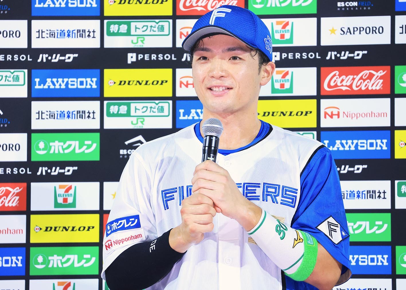 「きょうはファーストピッチでGACKTさまも来てらっしゃって、カリスマ性というものを見せていただいたので、僕も少し追い付けるように頑張っていきたいなと思います。8月始まってこれから1週間、遠征に行ってくるんので、なんとか全部、勝つぐらいの勢いでやっていきますので、また北海道から応援よろしくお願いします」
