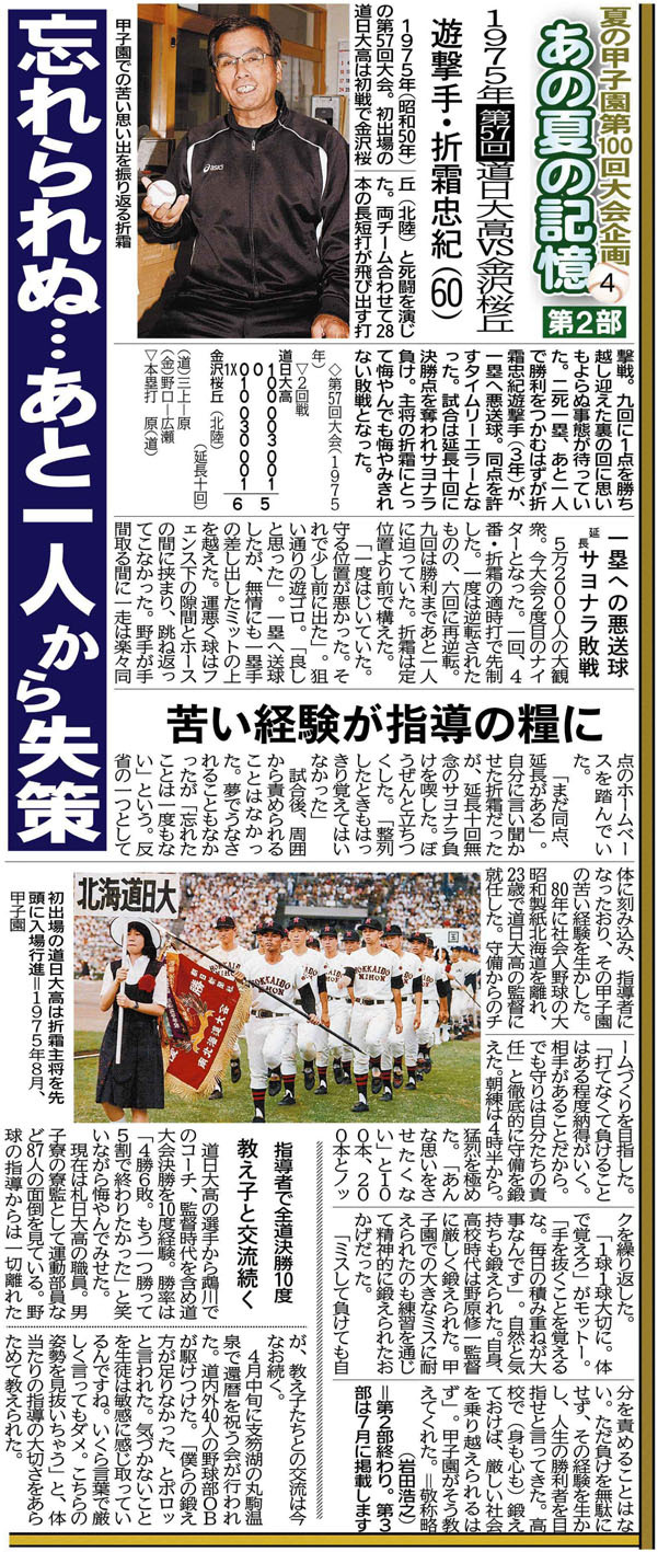 【甲子園100周年夏 道スポメモリーズ】⑧あの夏の記憶:1975年北海道日大高vs金沢桜丘 2018年6月22日紙面