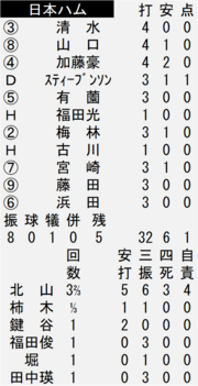 先発マウンドに上がった北山亘基投手(25)が守備の乱れもあり、四回途中5失点(自責点4)。0―0の三回、3安打に自身のけん制悪送球やバックの野選も絡み、3点を失った。1―3の四回には1死からヒットと連続四球で満塁。ここで2番の萩原に右犠飛を許した。代わった柿木蓮投手(24)も続く浅野にタイムリーを浴び、1―5とされた。