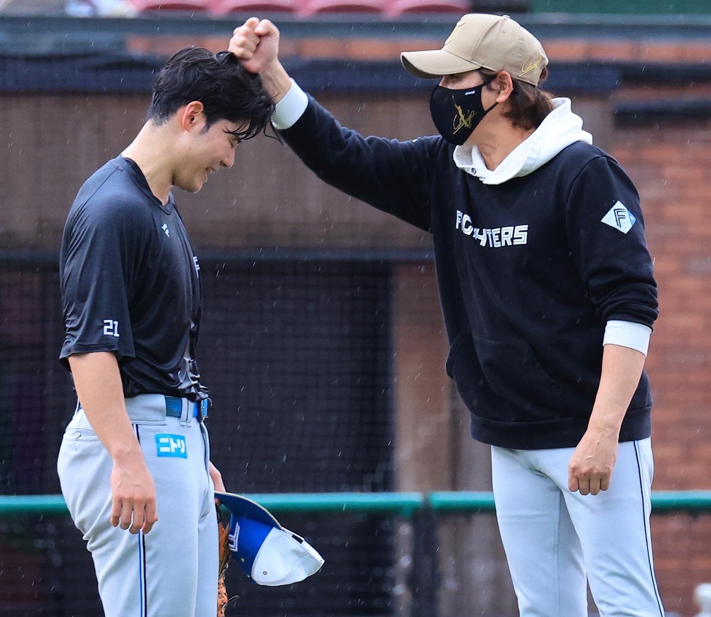 試合前練習で新庄監督(右)から前日の走塁ミスのお仕置きを受ける清宮