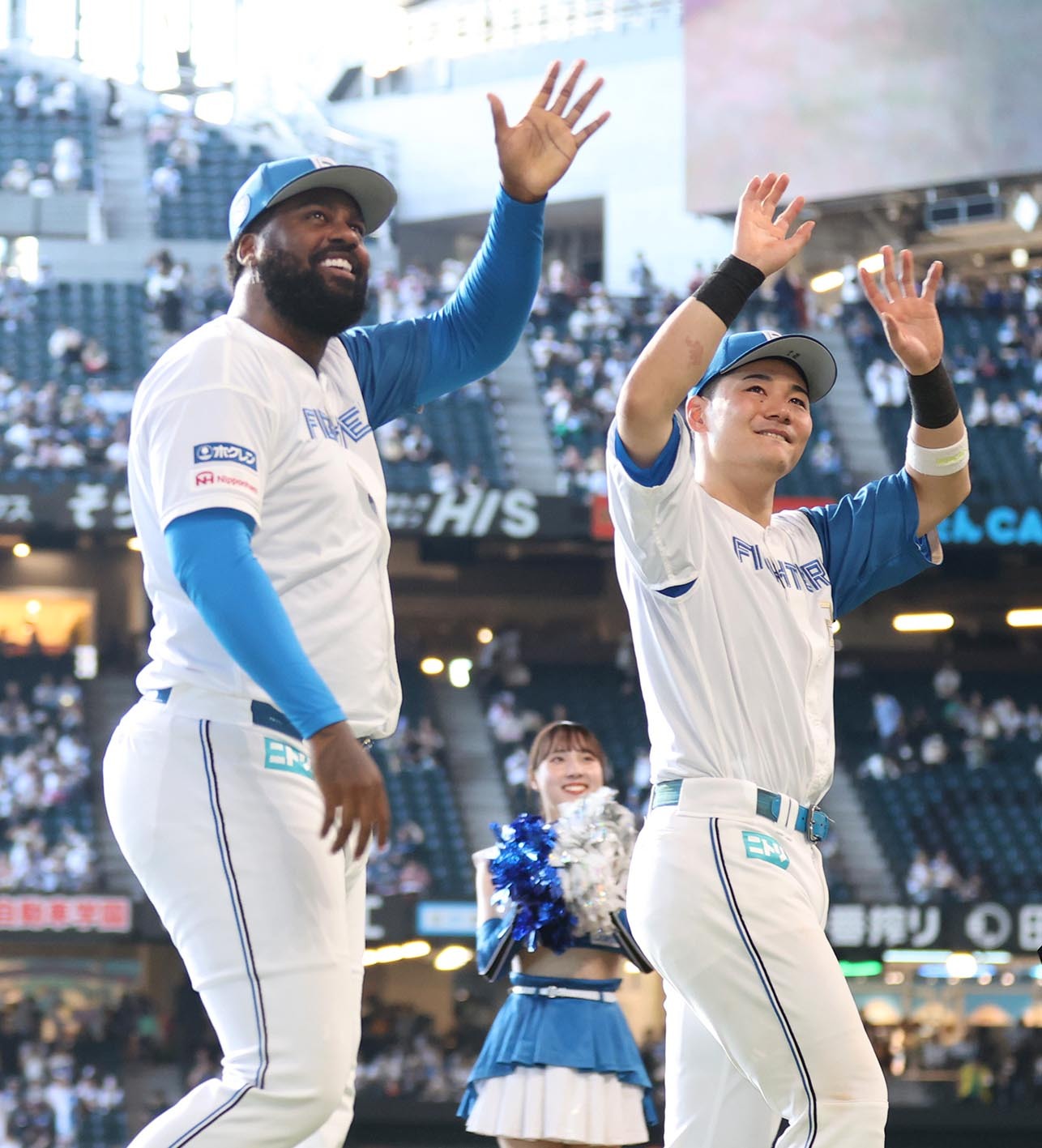 ヒーローインタビュー後に場内を一周するレイエス(左)と清宮=撮影・小川泰弘