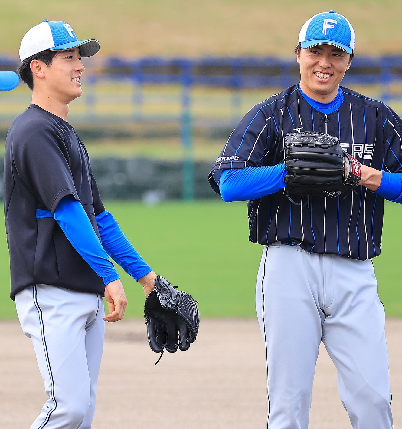 北山「僕が正義さんを知ったのは、(創価大時代に)NPB選抜対大学(日本代表)の試合を見ていて、半端じゃないなって。これがドラ1か~と見ていました。プロに入って、ファイターズに来ることが決まって、すげえって。話しかけられてうれしかったです。初めてしゃべった時に、本を読むのもそうですし、考え方とか、雰囲気が近いなって思いました。勝手ながら。本を紹介し合ったり。僕がたまたまクローザーをやっていたので、その時の話とか。僕は1年のうち半分しかやっていないですけど、言える範囲で話したりしました」