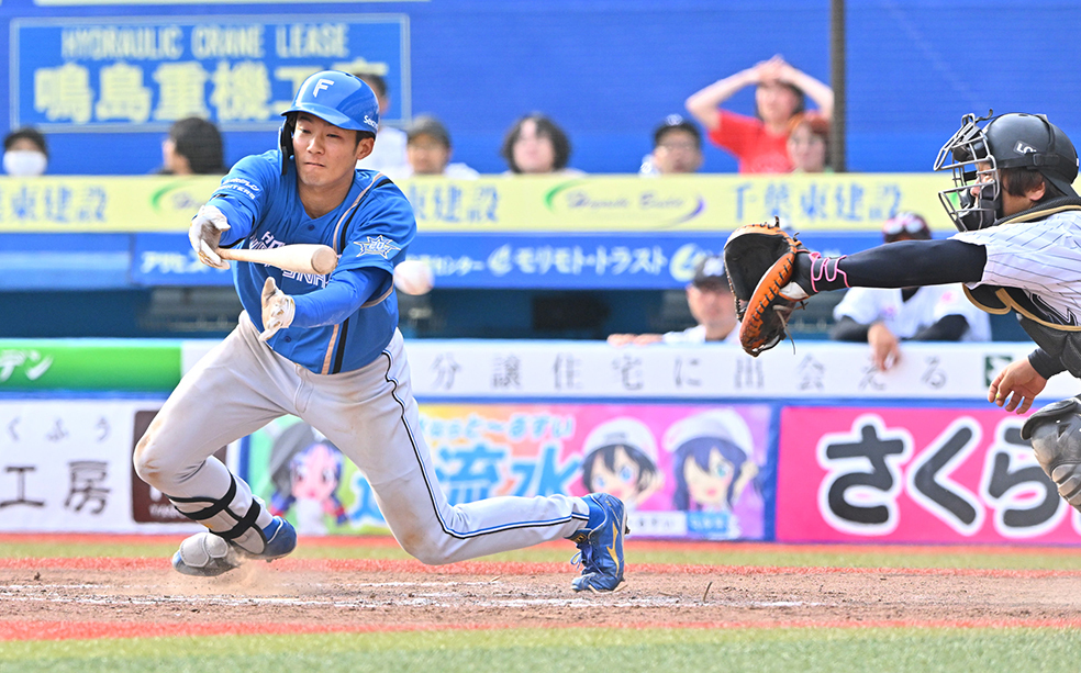 生粋の負けず嫌いを自認する新庄監督はリベンジを強く望んでいた。「去年、ロッテさんにサインを見破られていた。やっぱり男なら、そういう借りは返さないといけない」。ベンチワークでも引けを取らないと、証明する必要があった。メルセデスの投球と同時に、伏見がバットを寝かせる。体を投げ出すように低めボール気味の球を投前に転がした。