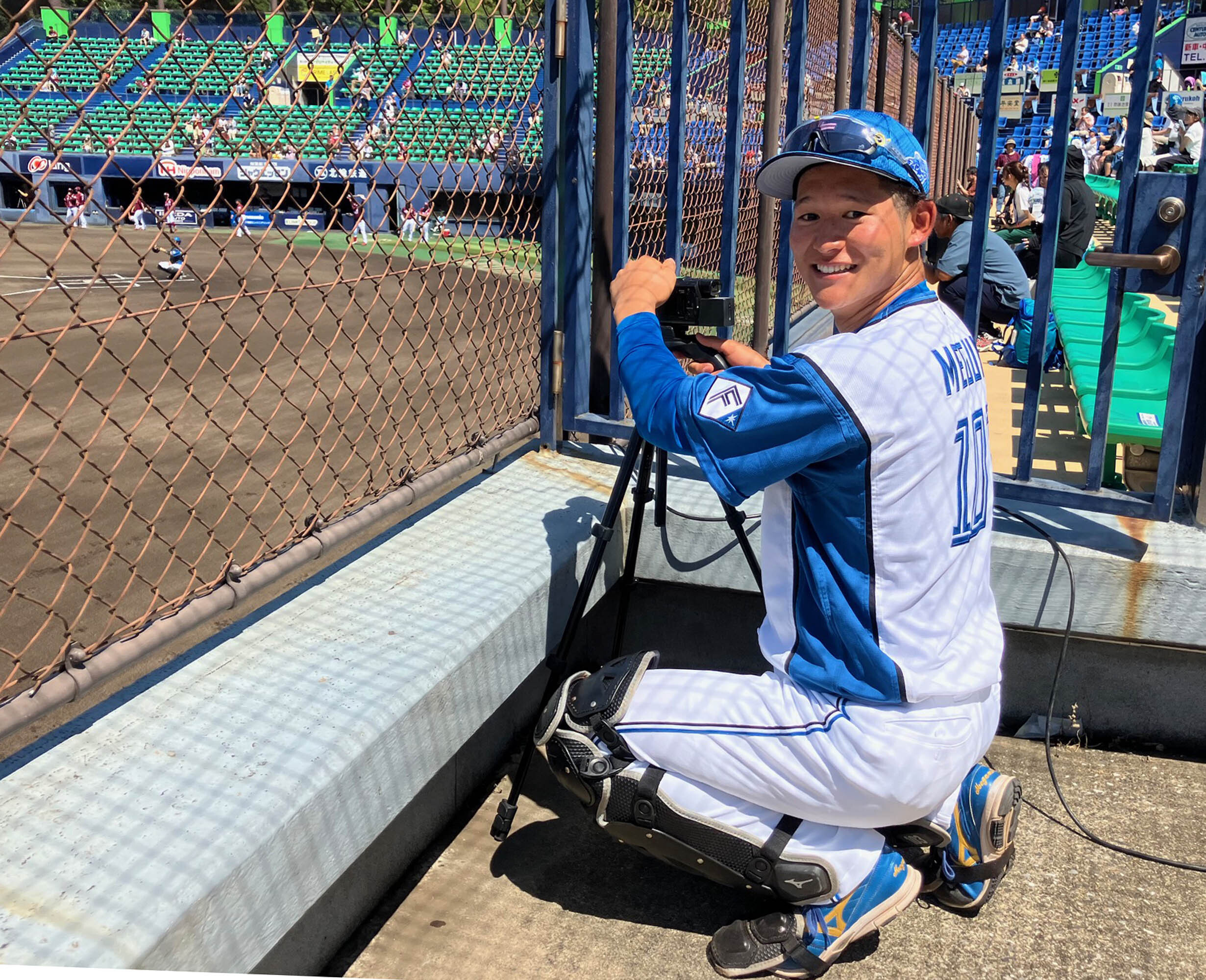 鎌ケ谷の三塁側カメラマンスペース。妙に人懐っこい選手と顔を合わせる。ビデオカメラを設置し、マウンドや打席に照準を合わせた。背番号「103」。恵健透さん(25)。本職はブルペン捕手。チームスタッフだった。
