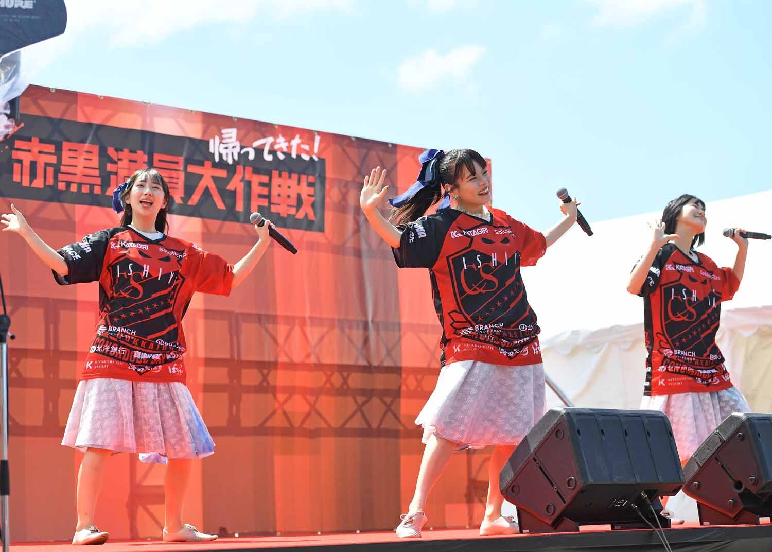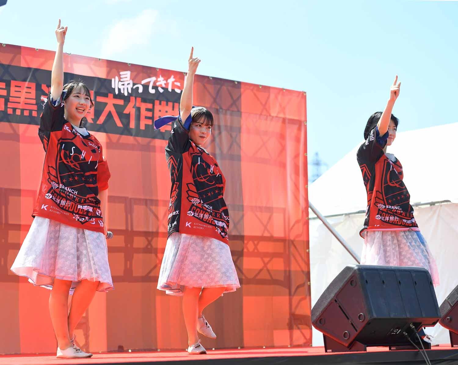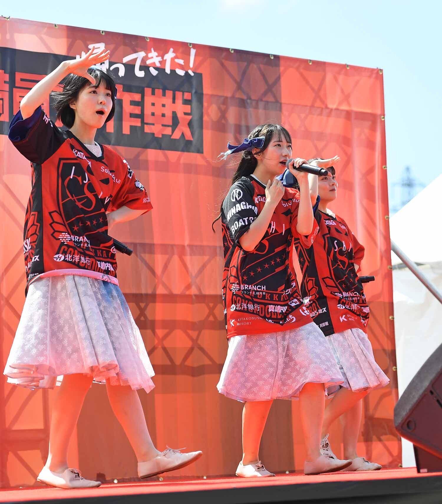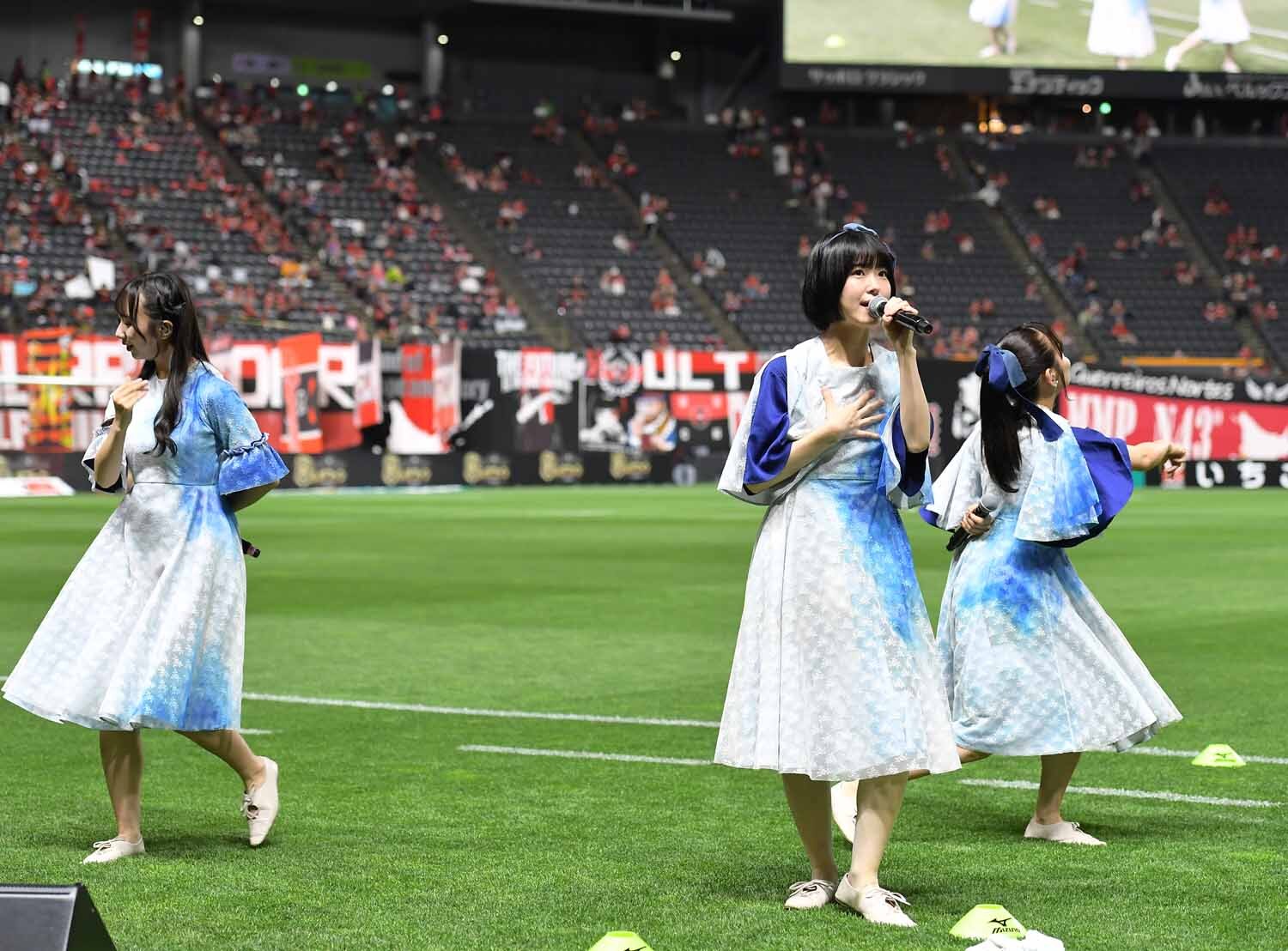 今回は8月10日に大和ハウスプレミストドームで、J1北海道コンサドーレ札幌対アビスパ福岡の試合前に行われたミニライブの模様を写真を中心に紹介する。まずはピッチで「鼓動」と「壊せ」を披露。そして、晴れ渡った屋外ステージでは、「花」と「道標」を青空に響かせた。試合中はハーフタイムバズーカにも参加するなど、全力応援で後押しした。