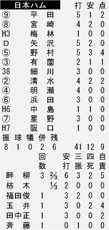 野村が2発4打点も玉井が勝ち越し打、田中正が追撃弾許す