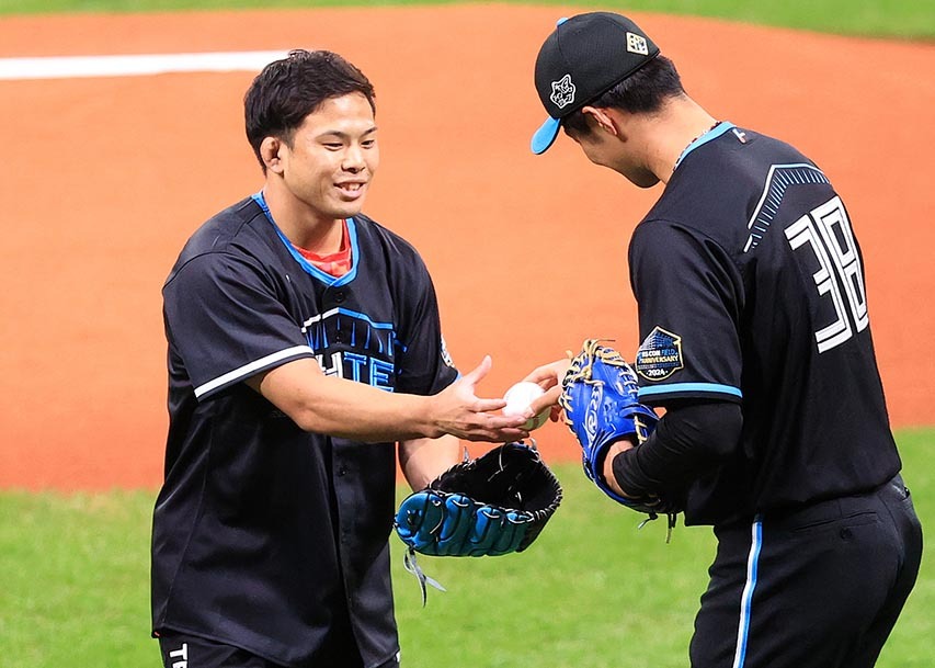 階級に合わせた背番号60のユニホームに袖を通し、マウンドに上がった。小さい頃からファイターズのファン。現役時代も応援していた新庄監督と対面し、写真撮影も実現した。