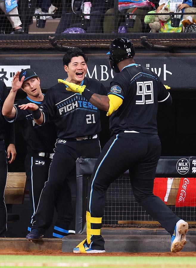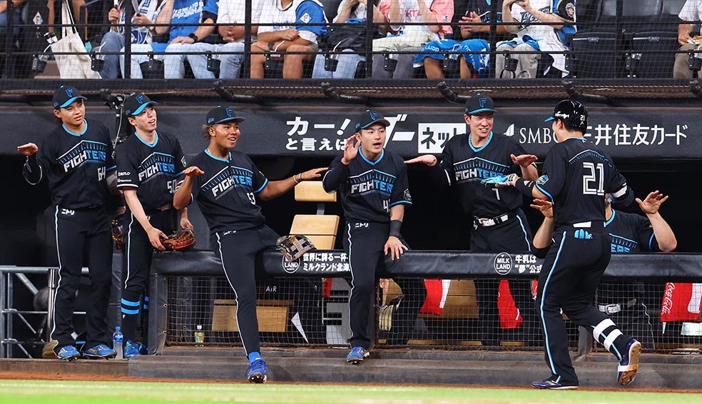 四回1死、9号ソロ本塁打を放った清宮(右)を〝キヨダンス〟で迎える日本ハムナイン