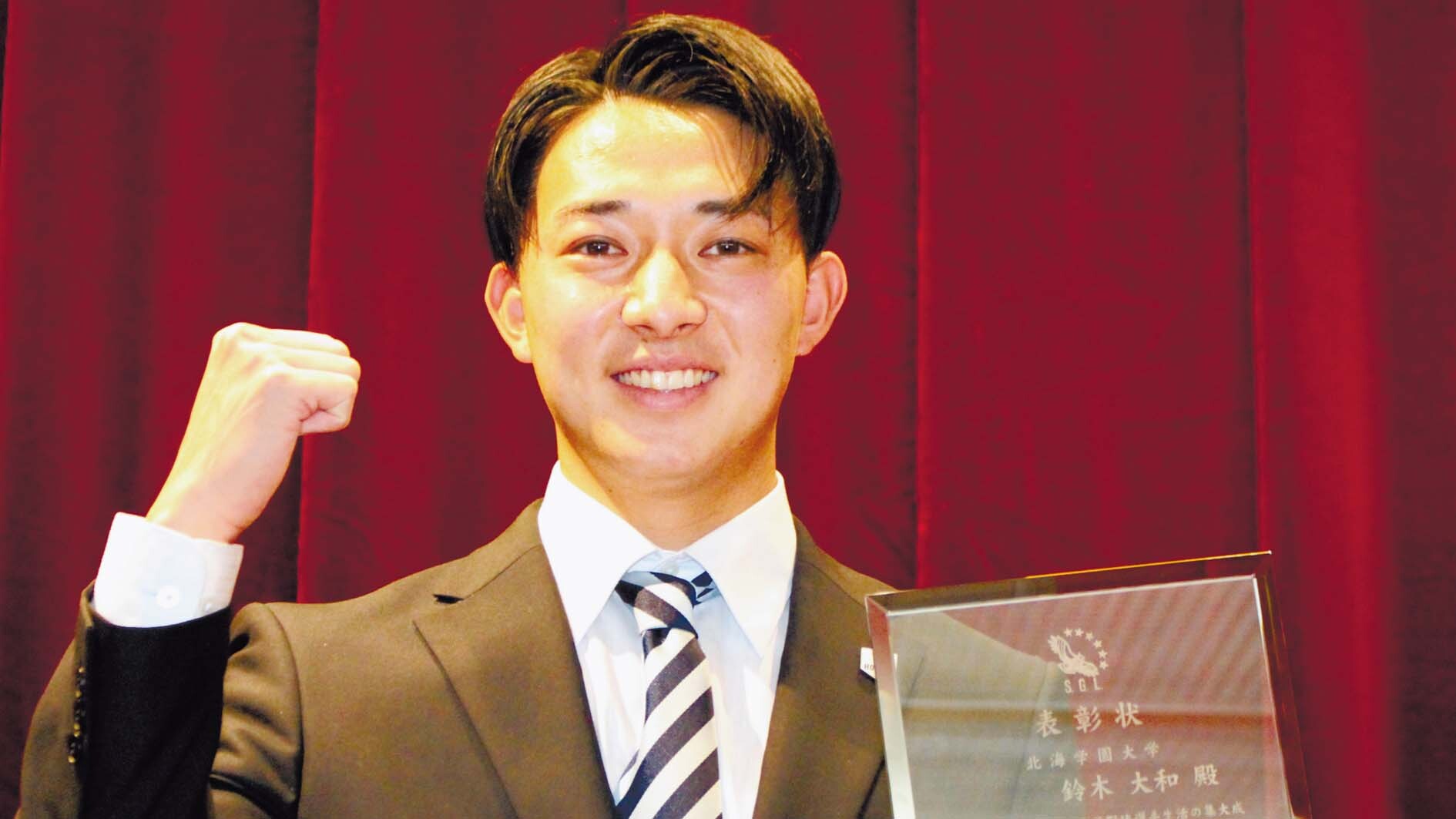 巨人に育成1位で指名された北海学園大の鈴木大和外野手(4年)が2日、札幌学生野球連盟から特別表彰を受けた。まもなく始まるプロ野球人生の本格スタートに向け「まずは支配下が目標。2年目とかではなく、入団してすぐ支配下になれるように頑張りたい」と抱負を述べた。