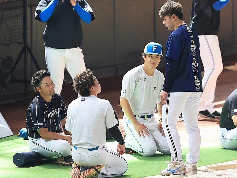 試合前、投手陣が練習する中堅付近に人の輪ができていた。中心にいたのは、昨オフにオリックスへトレード移籍した吉田。持ち前のコミュニケーション力を発揮し、元チームメートの伊藤、北山、金村らと楽しそうに話していた。