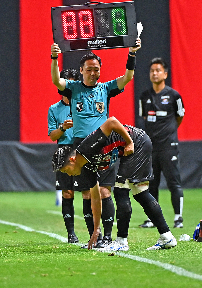 応援する全ての人々が待ちわびていた瞬間が、ついに訪れた。試合終了まであと10分を切った頃、ピッチよりも一段低いベンチ裏でウオーミングアップを行っていた札幌の選手の輪から、1人の選手が呼ばれてベンチへと続く階段を駆け上がっていった。