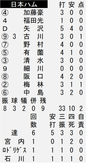 四回に8番・梅林優貴捕手(26)の中犠飛で先制。七回には3番・右翼で先発出場し、途中から一塁守備に就いた古川裕大捕手(26)の右犠飛で2点目を加えた。2番・指名打者でフル出場した矢沢宏太投手(24)は5打数4安打と快音を響かせた。