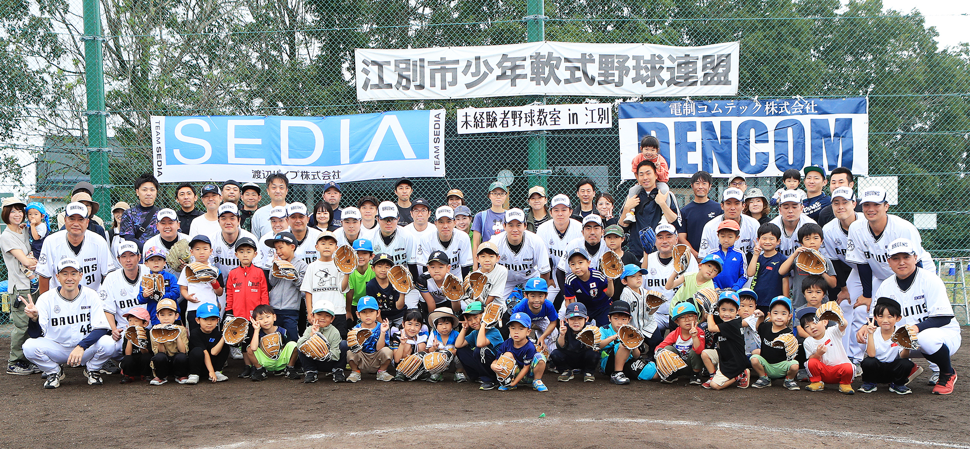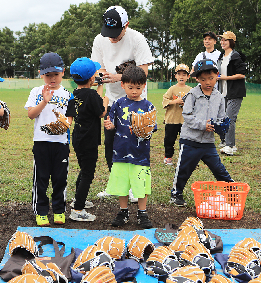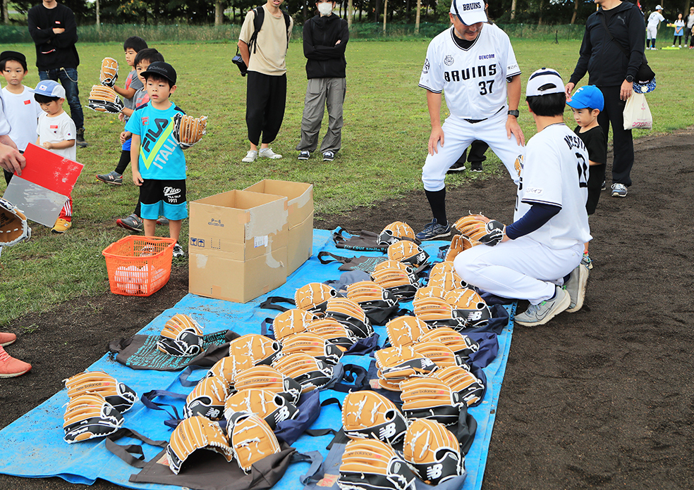 午前と午後の2回に渡って開催され、抽選で選ばれた66人とその保護者が参加した。江別市内のみならず、近隣の札幌市からも参加。日本ハムや、ドジャースのTシャツを着用した将来の球児たちが、グラブ寄贈の際に添えられた「野球しようぜ」の言葉通り、保護者と一緒に野球の楽しさを体感した。