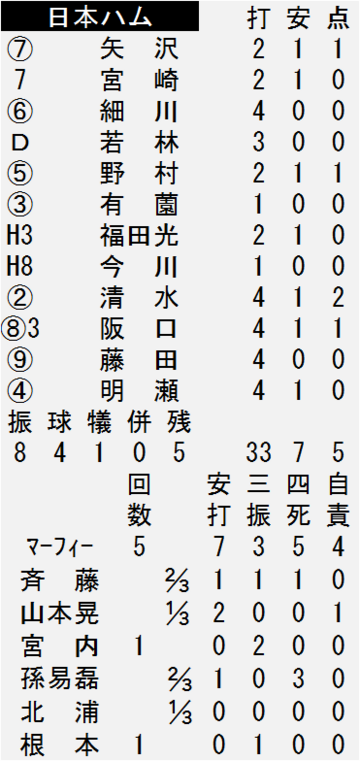 打線は一回に先頭の矢沢宏太投手兼外野手(24)、二回は阪口楽内野手(21)がソロアーチを放ってそれぞれ1点を返し、四回には清水優心捕手(28)が1死一、二塁から2点タイムリーツーベースを放って一時同点に追いついた。