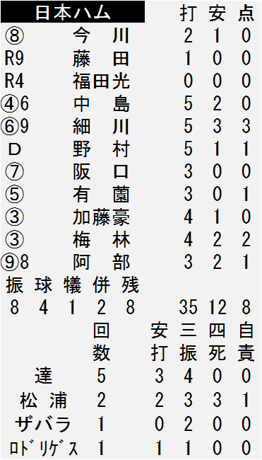 投手陣は、先発の達孝太投手(20)が5回3安打無失点で試合をつくり、2回を投げた2番手・松浦慶斗投手(21)は七回に連打と2四球で1点を献上したが、続くアニュラス・ザバラ投手(27)、ブライアン・ロドリゲス投手(33)はそれぞれ打者3人でシャットアウト。西武打線を寄せつけなかった。