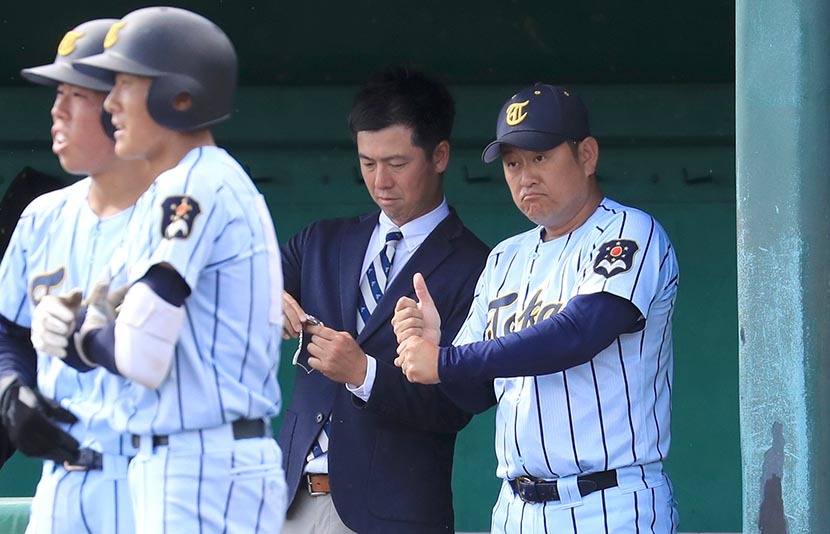 東海大札幌高の部長から就任した遠藤新監督(右)は、初陣を五回コールドで勝利した
