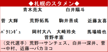 札幌はG大阪から期限付き移籍しているFW鈴木武蔵(30)が契約上出場できず、4-4-2の布陣で挑んだ。2トップはMF青木亮太(28)と古巣対戦で今夏の移籍後J1初先発となったFW白井陽斗(24)。すると、前半8分にその白井が相手DFライン裏に抜けたボールに反応。一度はDF福岡にボールをキープされながらも自ら奪い返し、ゴールエリア右角まで侵入。そこから左足でファーに流し込み、J1初得点となる先制ゴールを挙げた。