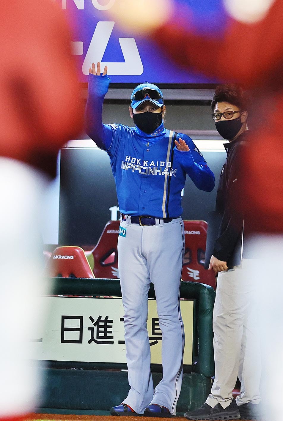 レギュラーシーズン最終戦を終え、スタンドに向かってあいさつする新庄監督(右)ら