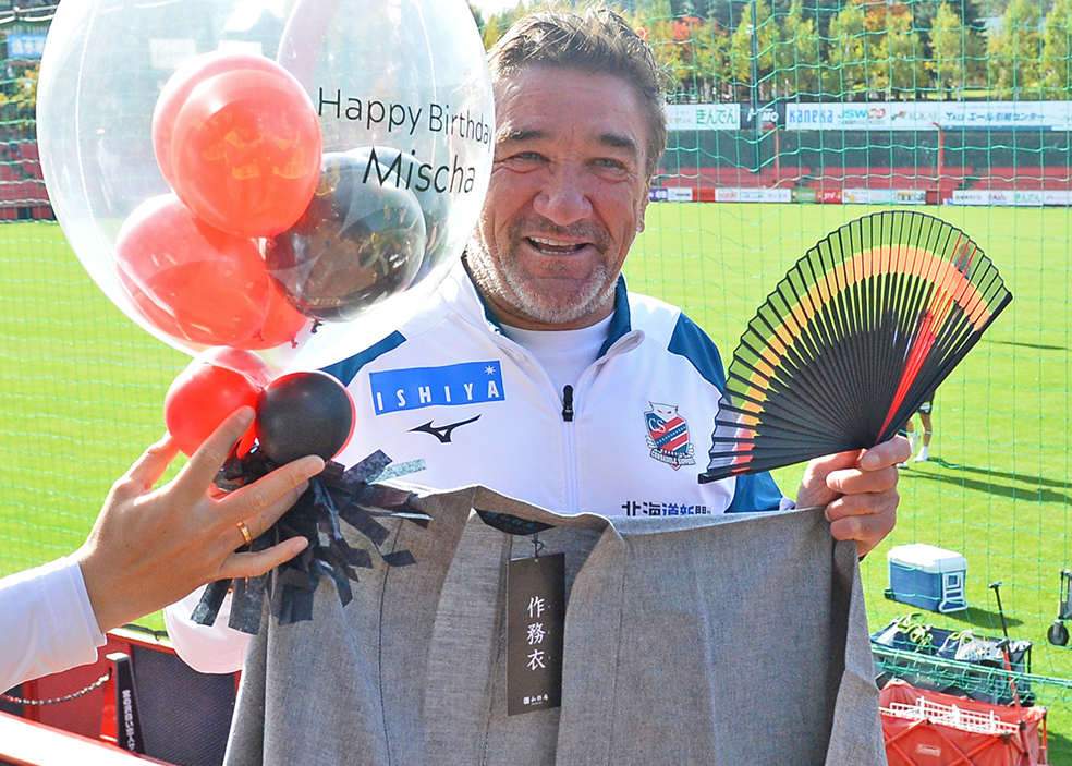 札幌の監督に就任してから7回目の記念日となった18日、宮の沢には多くの報道陣が詰めかけた。練習後の囲み取材では、報道陣からの誕生祝いとして名前入りの作務衣と、赤黒の扇子をプレゼント。J1残留に向けて厳しい戦いが続く中ではあるが、このときばかりは指揮官も表情を崩した。