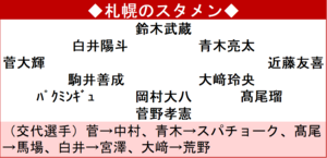 1-0で折り返した後半、何度もピンチをしのぎ、交代枠も使い切った。後半38分、名古屋のDF三国が2度目の警告で退場となった。1人多い有利な状況となり、札幌は待望の2点目を加えた。後半43分、途中出場のMFスパチョーク(26)が左サイドを攻め上がり、DFパクミンギュ(29)にパス。パクミンギュからのクロスをFW鈴木武蔵(30)が落ち着いて決めた。