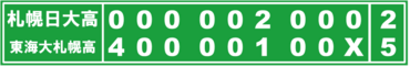 東海大札幌高は矢吹が一回の立ち上がりを3者凡退に斬って取ると、強力打線が札幌日大高の高坂に襲いかかった。1番・山口聖夏遊撃手(2年)がフルカウントから中前打。四球と3番・鈴木賢有捕手(2年)の中前打などで1死満塁。4番・太田勝馬一塁手(2年)は三振に倒れたが、続く5番・太田勝心中堅手(まさむね、2年)が中越えの走者一掃三塁打で先制。さらに6番・八鍬航太朗二塁手(2年)の中前打で、一挙4点を奪って先手を取った。