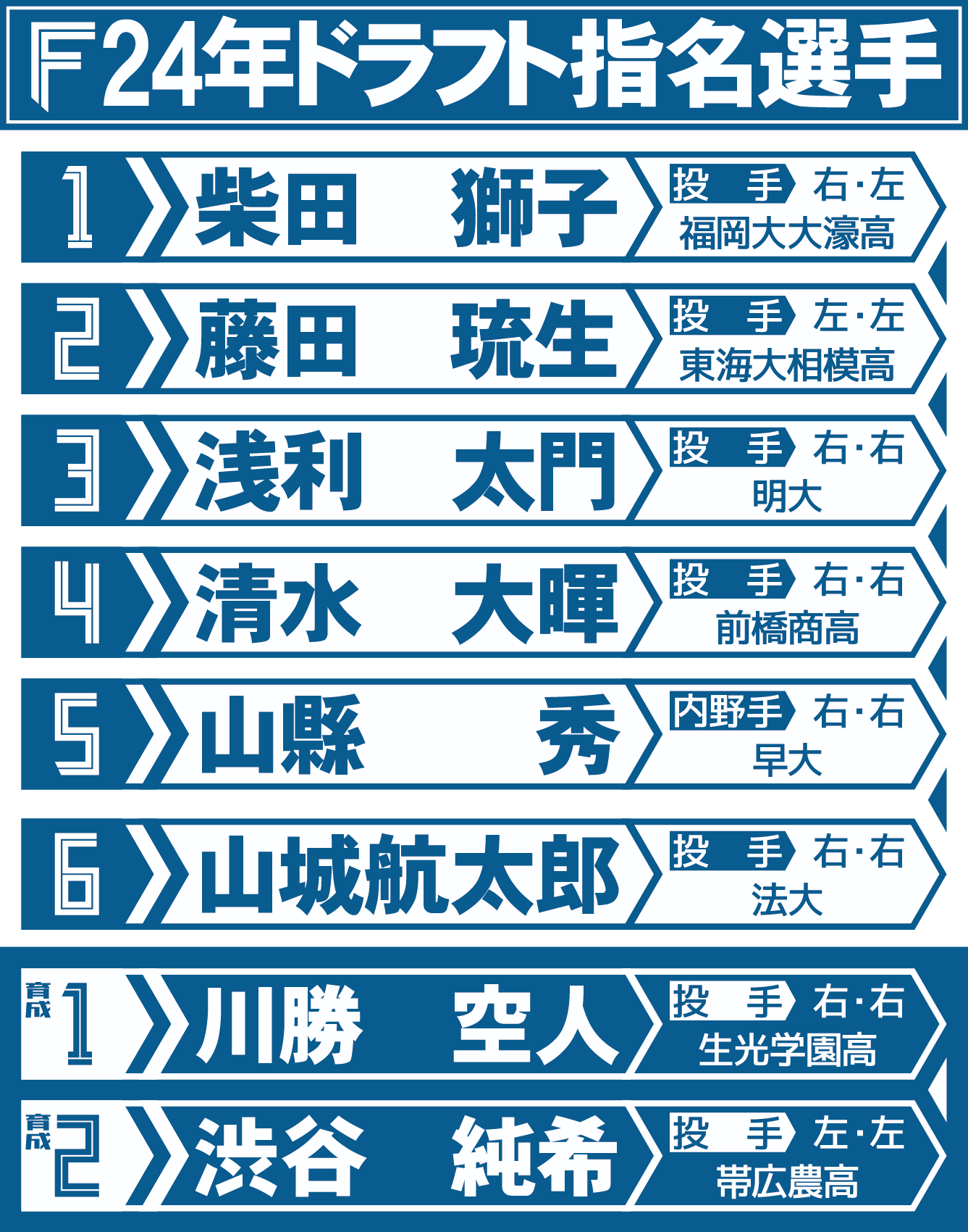 日本ハムは支配下6人、育成2人を指名した。1位の柴田(福岡大大濠高)は投手だが、打者としても高く評価されている。全体としては投手7人、内野手1人の内訳となった。