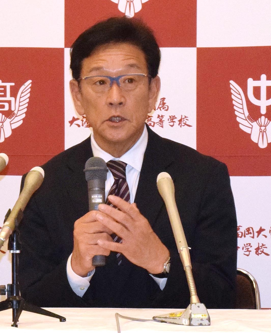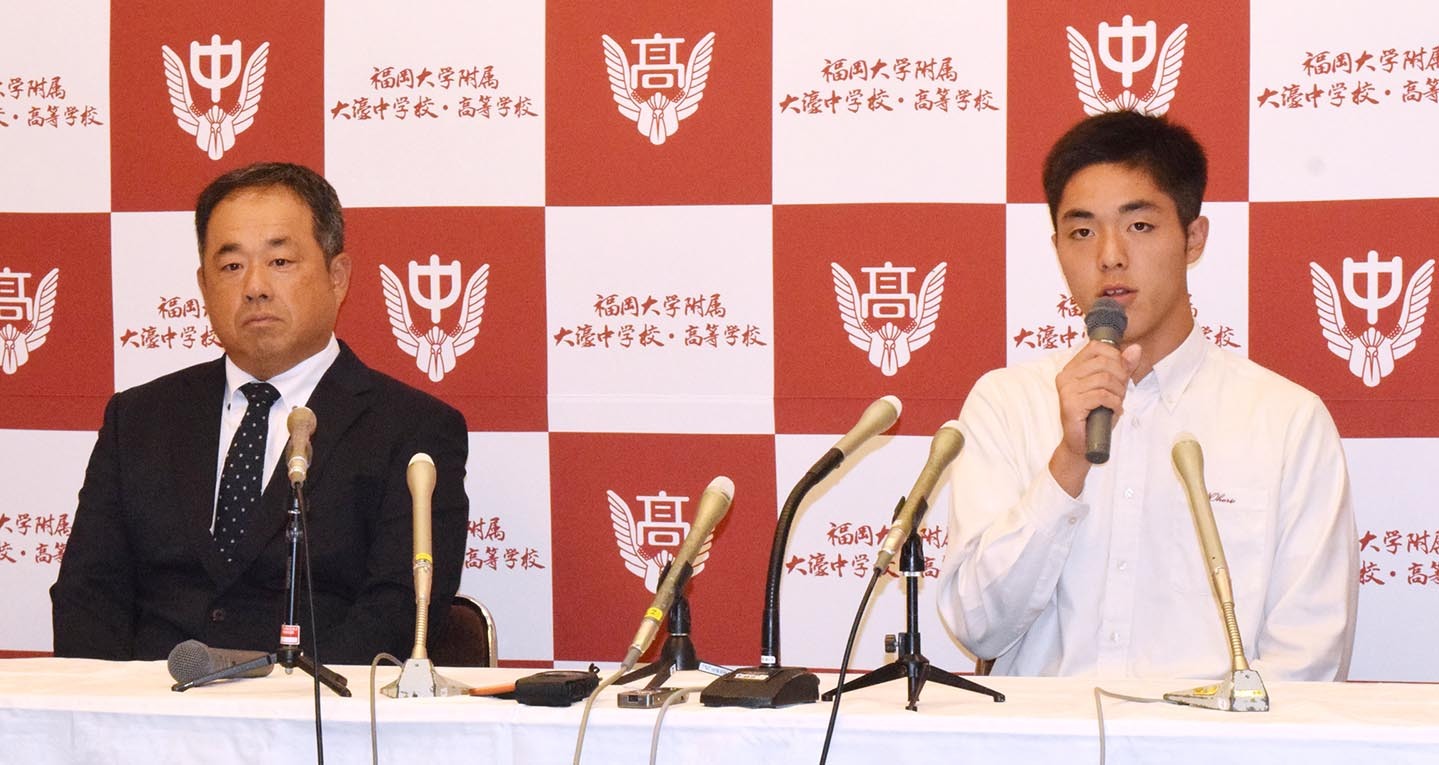 福岡大大濠高の八木監督(左)と会見に出席した柴田