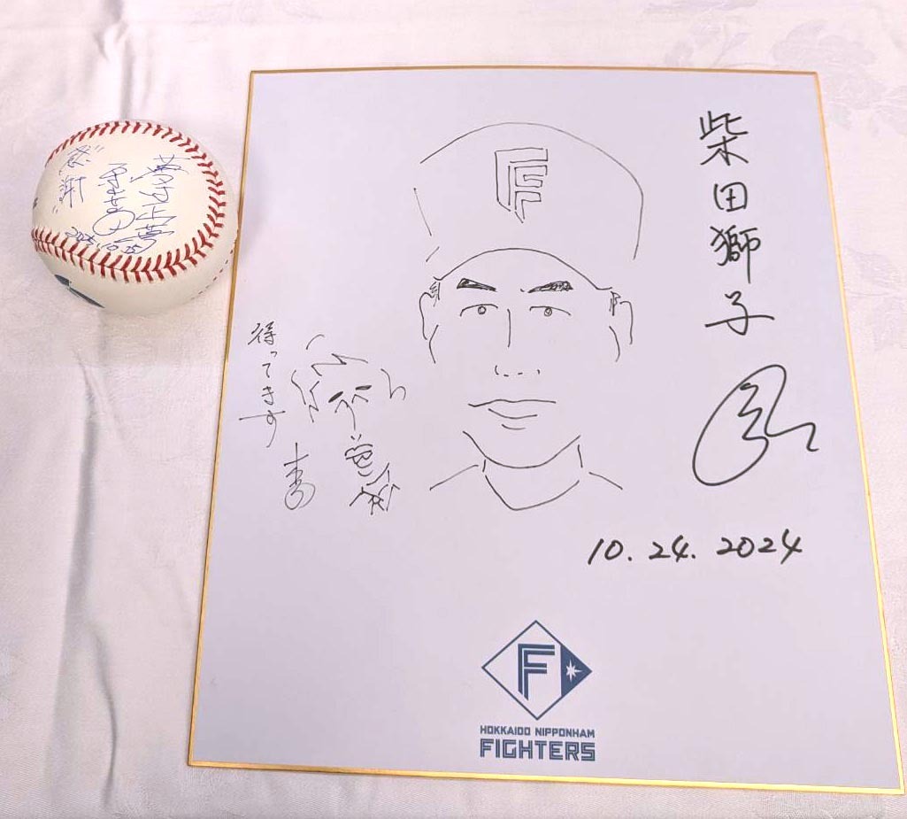 木田GM代行が描いた柴田の似顔絵と栗山CBOがメッセージを記したWBC公式球
