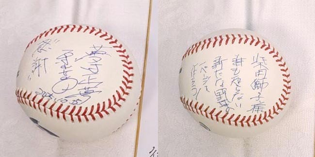 WBC公式球の前面には座右の銘である『夢は正夢』、後面には『柴田獅子様 誰も知らない新たな野球の一ページを作ろう!』と記されている。
