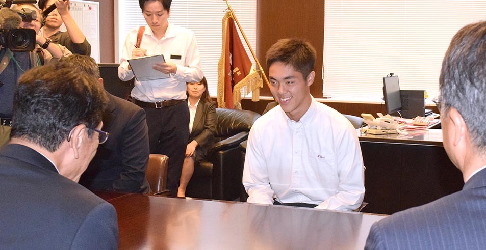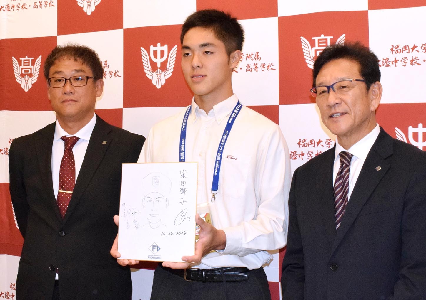 プロ野球のドラフト会議で日本ハムから1位指名された福岡大大濠高の柴田獅子投手(18)が25日、同校で栗山英樹CBO(チーフ、ベースボール、オフィサー、63)から指名あいさつを受けた。