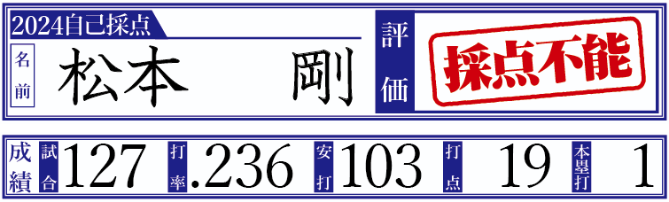 「何点というのは、難しいです。個人的なことで言えば、採点できないぐらいひどかったなと。…採点不能で。思うような結果が残せなくて、チームの足を引っ張ってしまった。反省ばかり浮かぶシーズン。すごく悔しいですし、もどかしさがありました。ただ、チームが勝つことによって、救われた部分もありました。打撃がダメでも守備でなんとかしようとか、やれることを探しながら。バッティングは難しさを感じましたけど、まだまだ成長できるなと感じたところもたくさんありました。プラスに捉えれば、いい勉強、いい経験ができたと思う。つらい、悔しい1年でしたけど、いい1年でもあったかなと。年齢も上になってきましたけど、それを理由にしたくない。このオフ、しっかり取り組んで成長していけたらいい。そのためにも前を向いてやっていかないといけない」