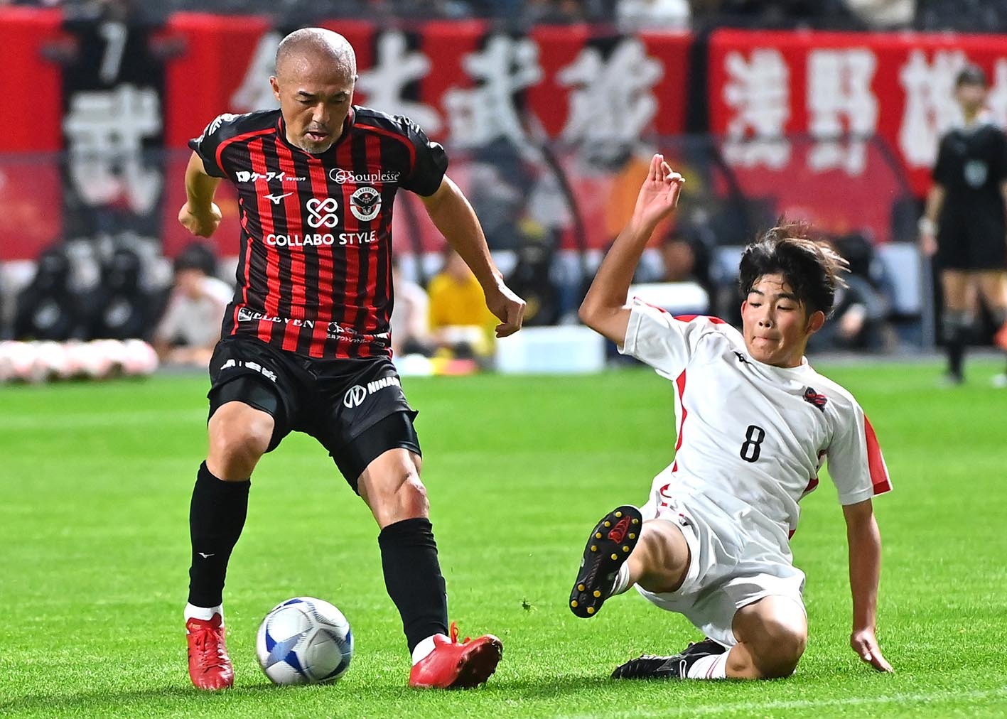 後半、Uー15の砂川(右)が小野伸にスライディングタックルを仕掛ける