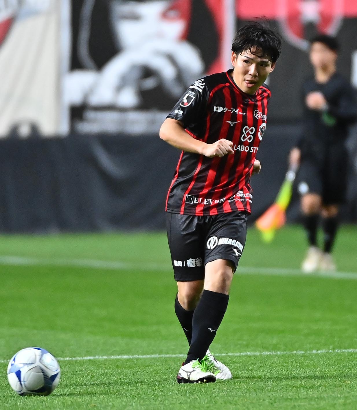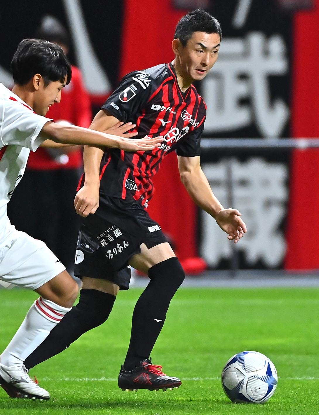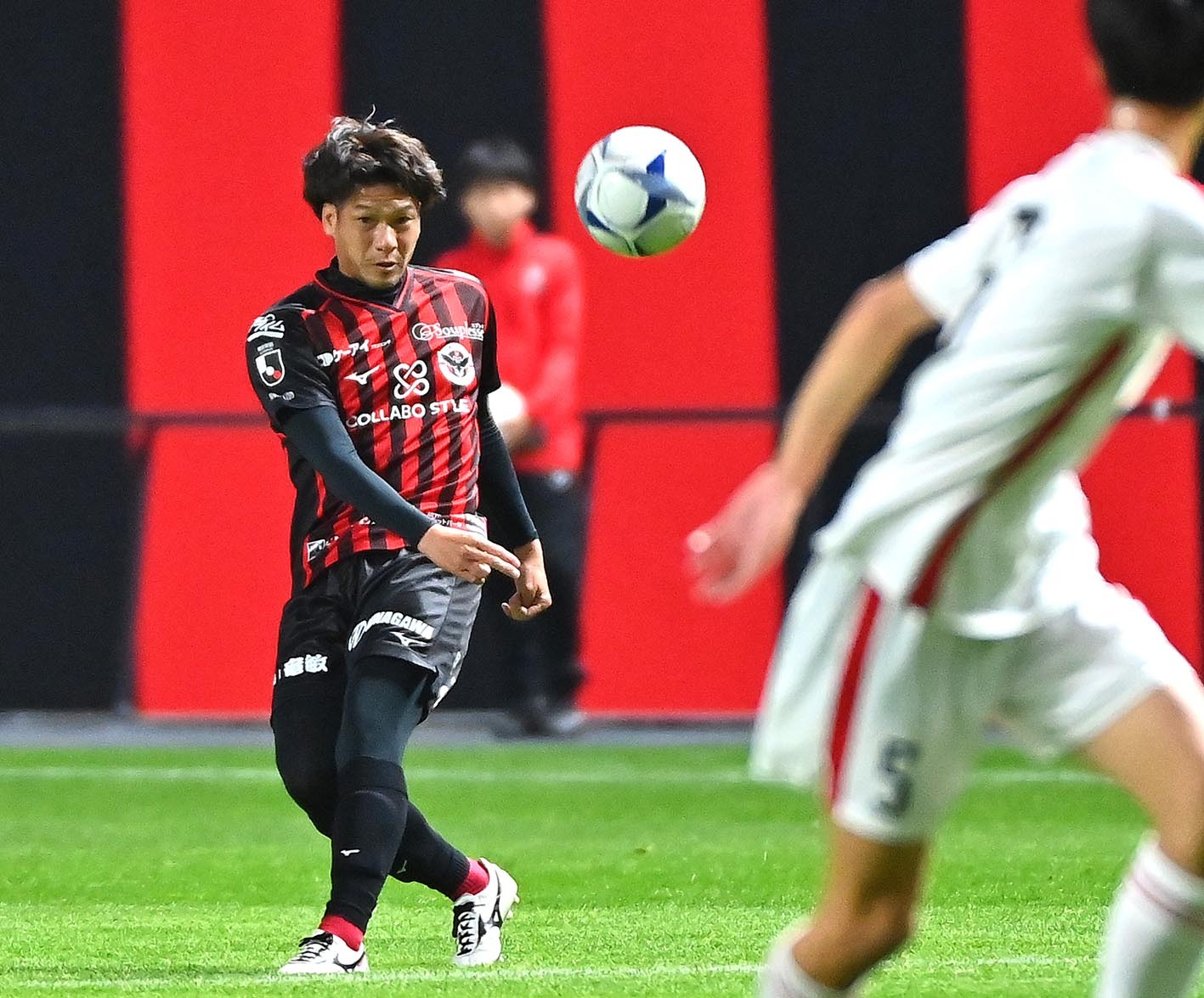 後半、ロングパスを出す河合竜二