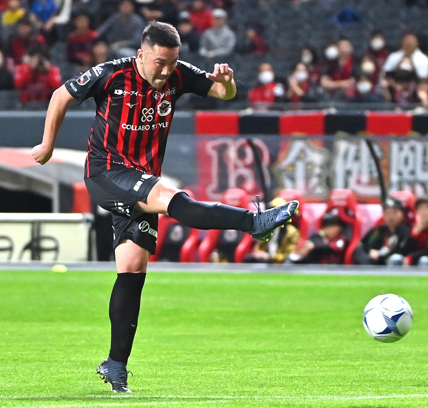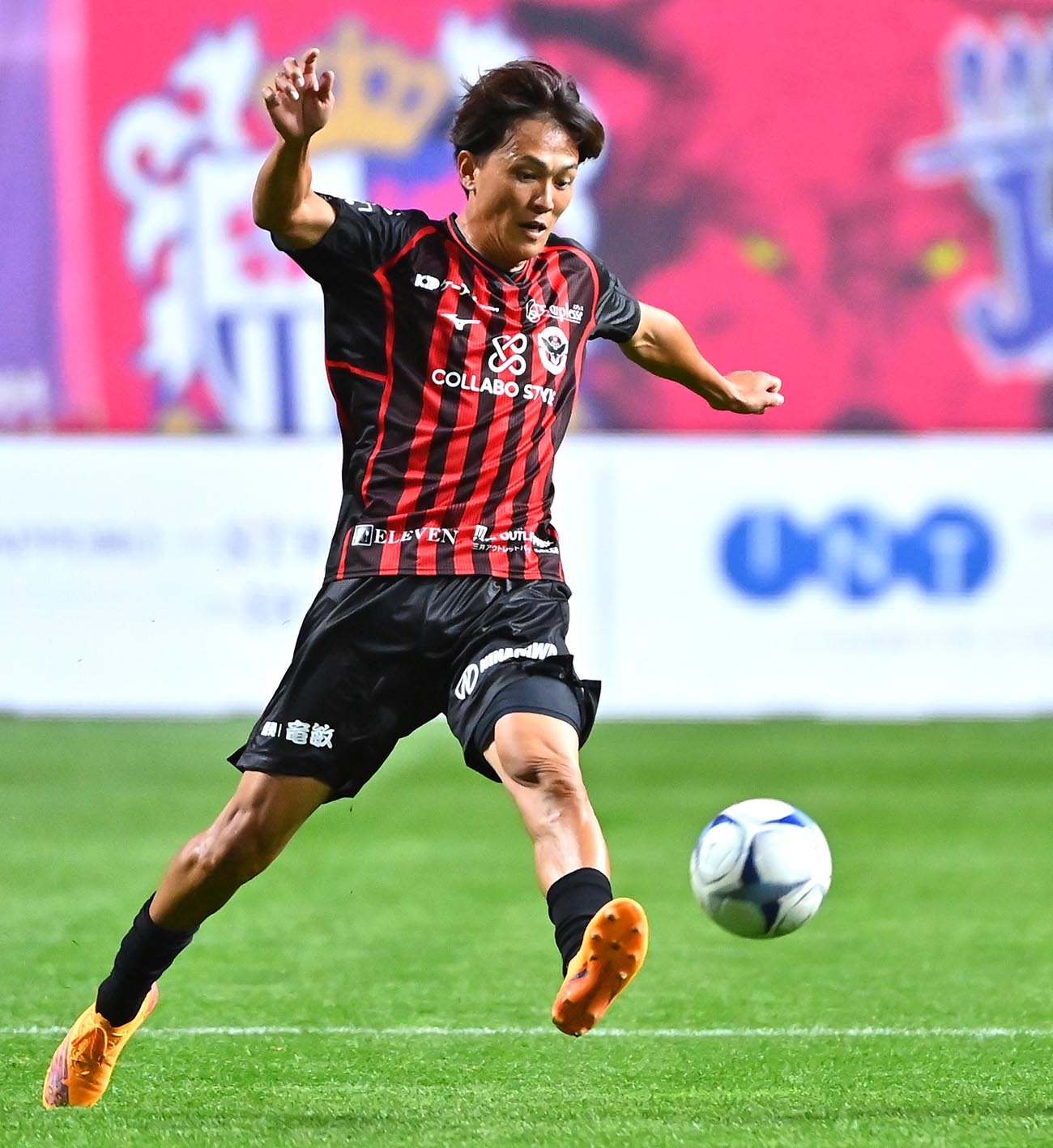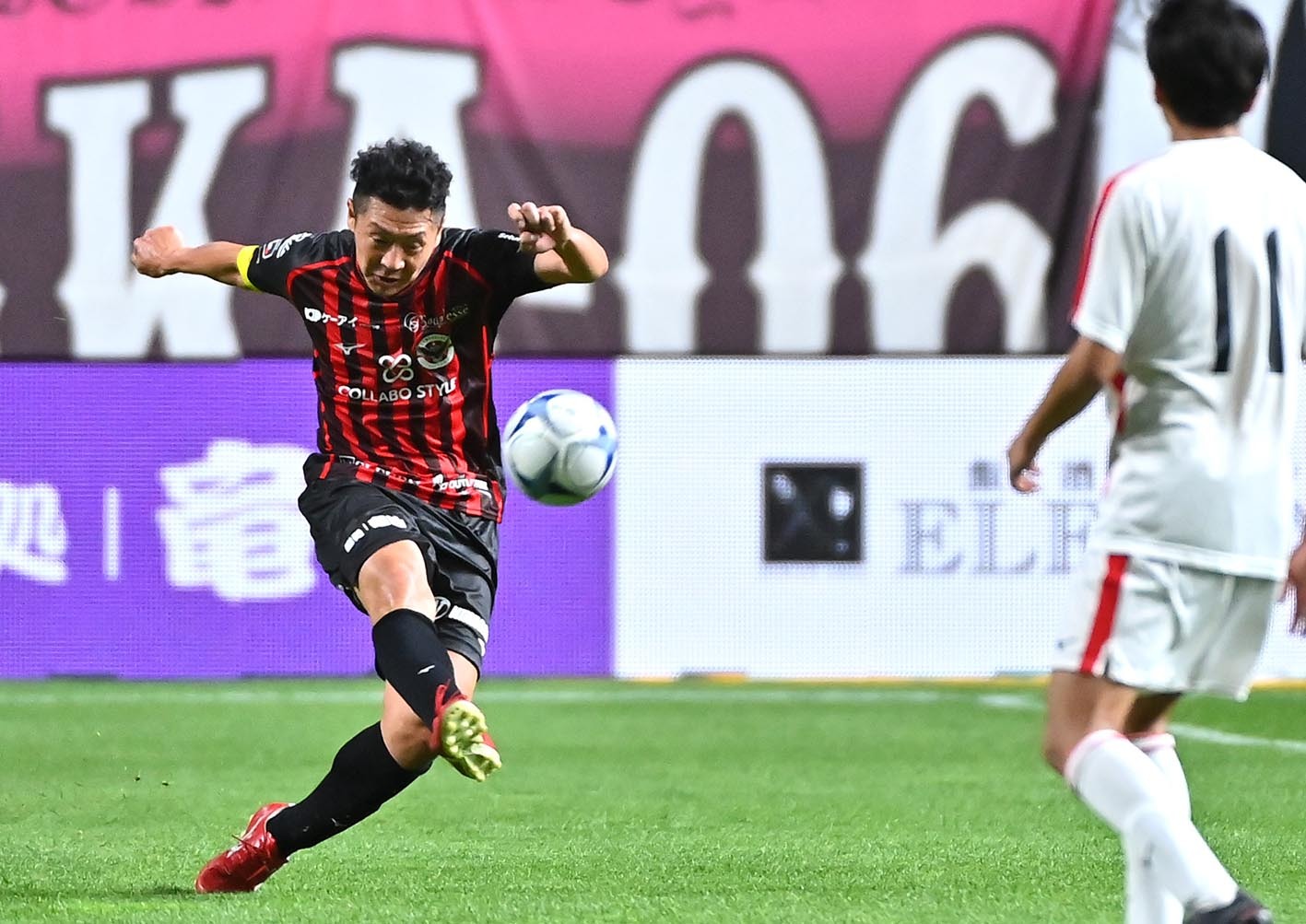 後半、ロングパスを出す河合竜二