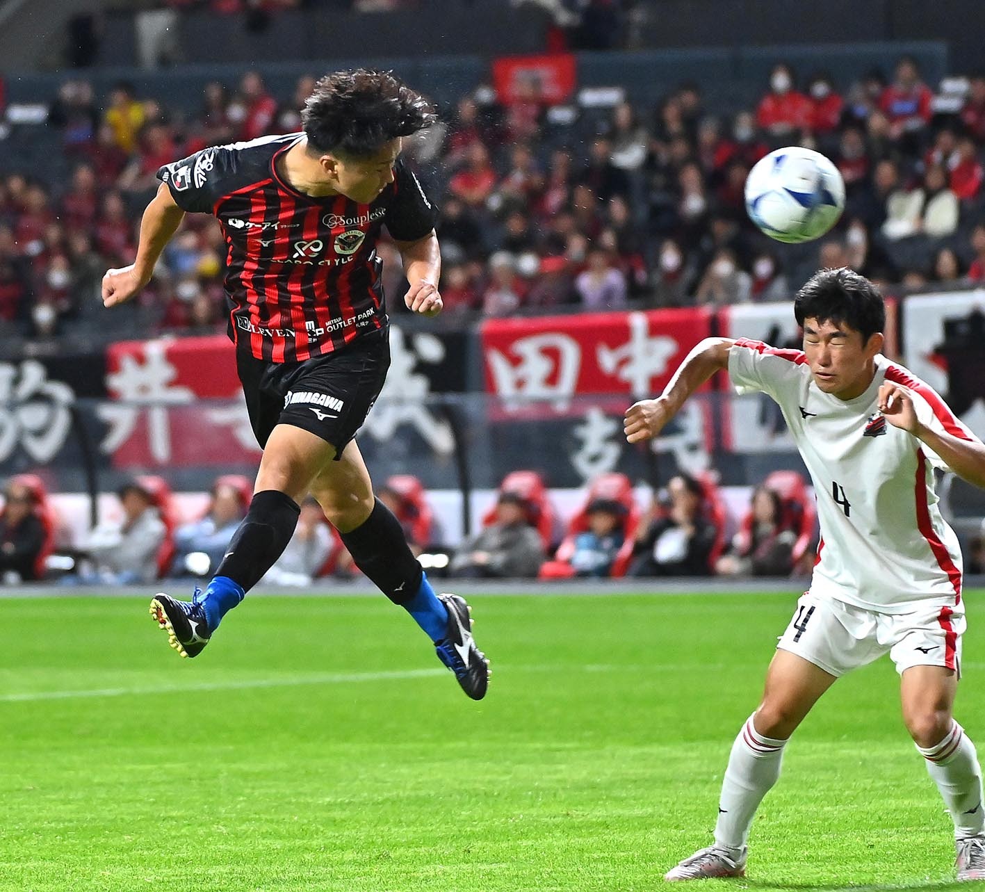 後半、クロスをヘッドで合わせる横野純貴