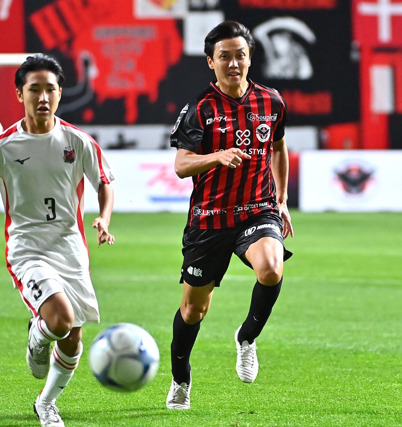 後半、ロングボールを追いかける藤田征也(右)