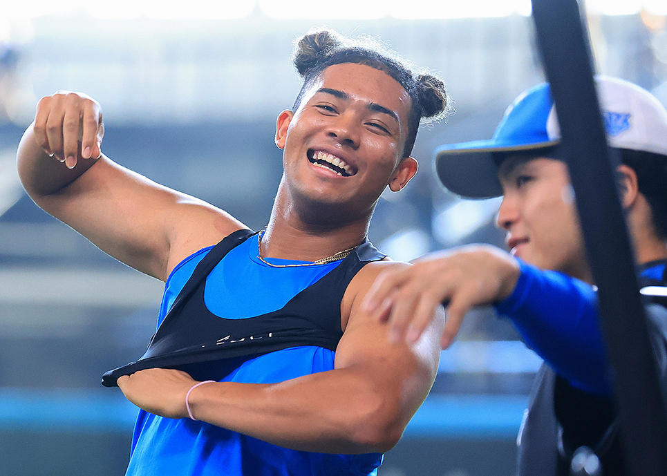 記者はこのヘアスタイルをどう表現すれば良いのか、本人に尋ねた。すると「お団子…2個。お団子ツインみたいな感じです」と苦笑い。ウオーミングアップが終わり、打撃練習に備えてヘルメットをかぶる時には、ほどいて元通りになっていた。