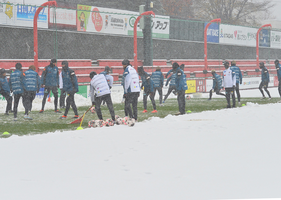負けられない湘南戦を2日後に控えたこの日、札幌が〝冬将軍〟の洗礼を浴びた。前日夜から札幌市内で降り出した雪は、日付が変わってもやまずに降り続け、街中の風景を一変させた。宮の沢の練習場も例外ではなく、前日まで顔を出していた緑の芝生は、厚い雪に覆われて一面真っ白に。とてもグラウンド全面を使用してトレーニングを行う状況ではなく、スタッフが一部除雪して、ボール回しを行うだけのスペースを確保するのが精いっぱいだった。札幌在籍7年目となる駒井も「北海道なので。仕方ないですね」と、例年よりも6日早い積雪に苦笑いを浮かべるしかなかった。