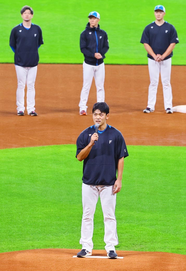 「秋季キャンプ、お疲れさまでした。松本選手会長より指名していただきましたので、締めのあいさつをさせていただきたいと思います。まずはじめに、エスコンフィールド関係者の皆さま、球団関係者の皆さま、たくさんのサポートをありがとうございました。そして球場に足を運んでくださったファンの皆さま、たくさんのご声援ありがとうございました。皆さまのおかげで充実したキャンプを過ごすことができました。来年はリーグ優勝、日本一になるために一人一人が自覚を持ち、シーズンオフを過ごしていきましょう。それではシーズン同様にファンの皆さまと一丁締めで締めたいと思います。お手を拝借」
