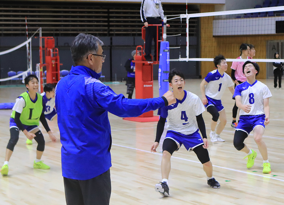 中村コーチが女子の監督を務めていることから平日の練習は女子が終わってから90分程度しかない。180センチ以上ある選手はいないが、山上主将は「ドカーンとて決めるよりも、つないで決められるところで決める」と、粘って少ないチャンスをものにして支部を勝ち上がってきた。スタンドには午前中に敗れた女子が声をからして大声援。「応援のおかげで勝てました」と感謝した。